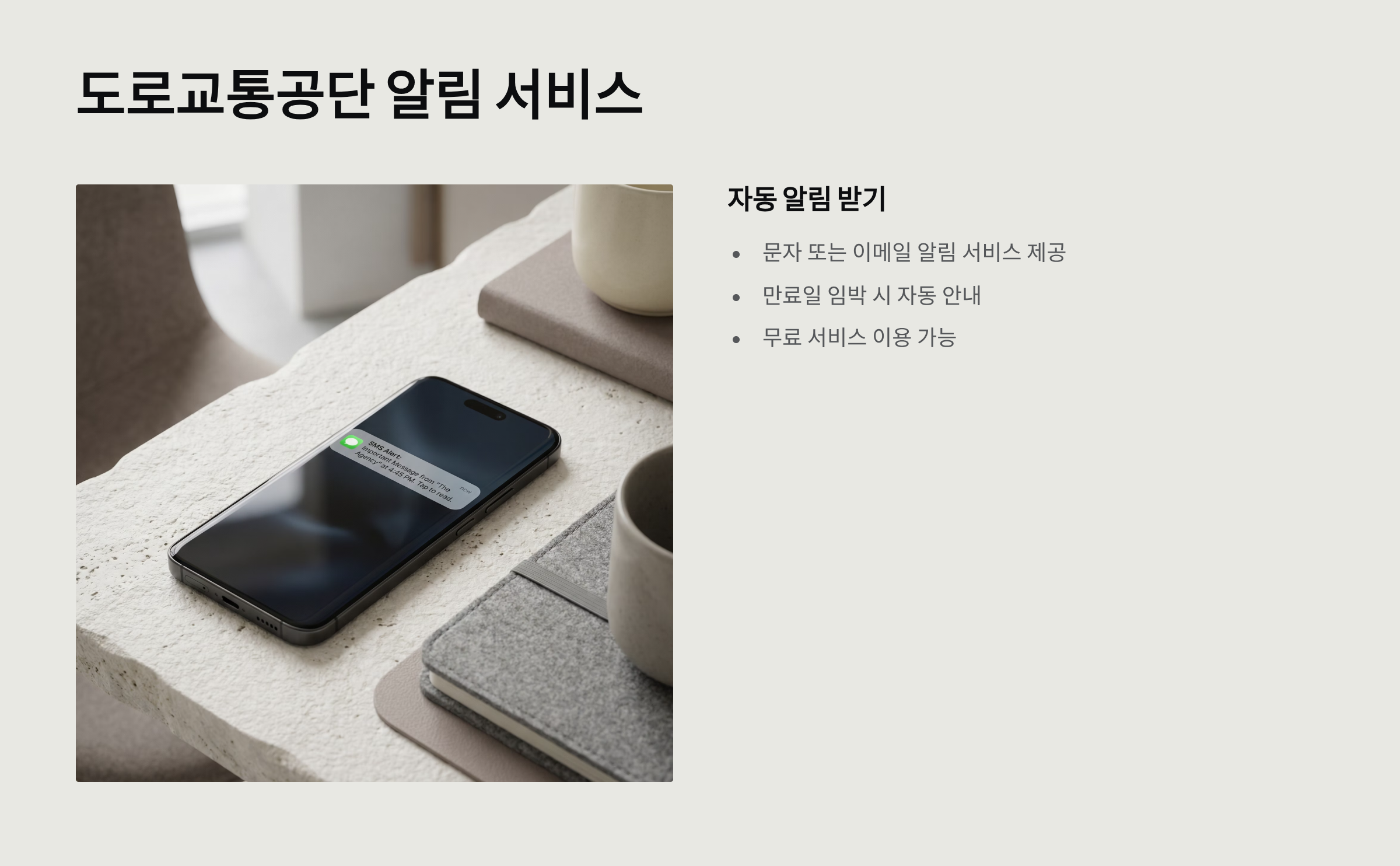 - 도로교통공단에서 제공하는 문자 또는 이메일 알림 서비스 이용