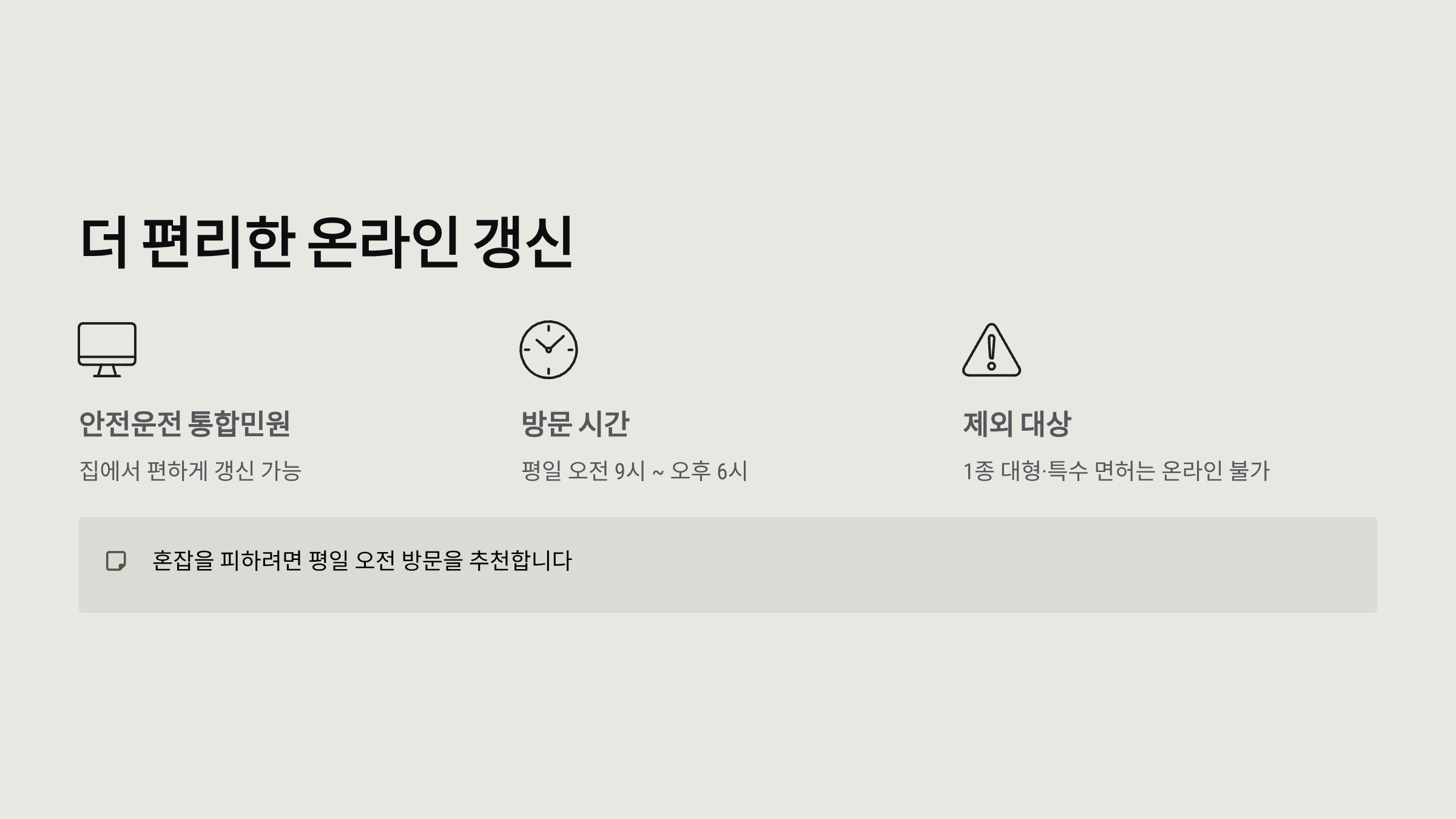 2025년부터는 온라인으로도 갱신이 가능합니다. 안전운전 통합민원 시스템을 이용하면 집에서 편하게 할 수 있습니다 (단, 1종 대형·특수 면허는 온라인 불가).