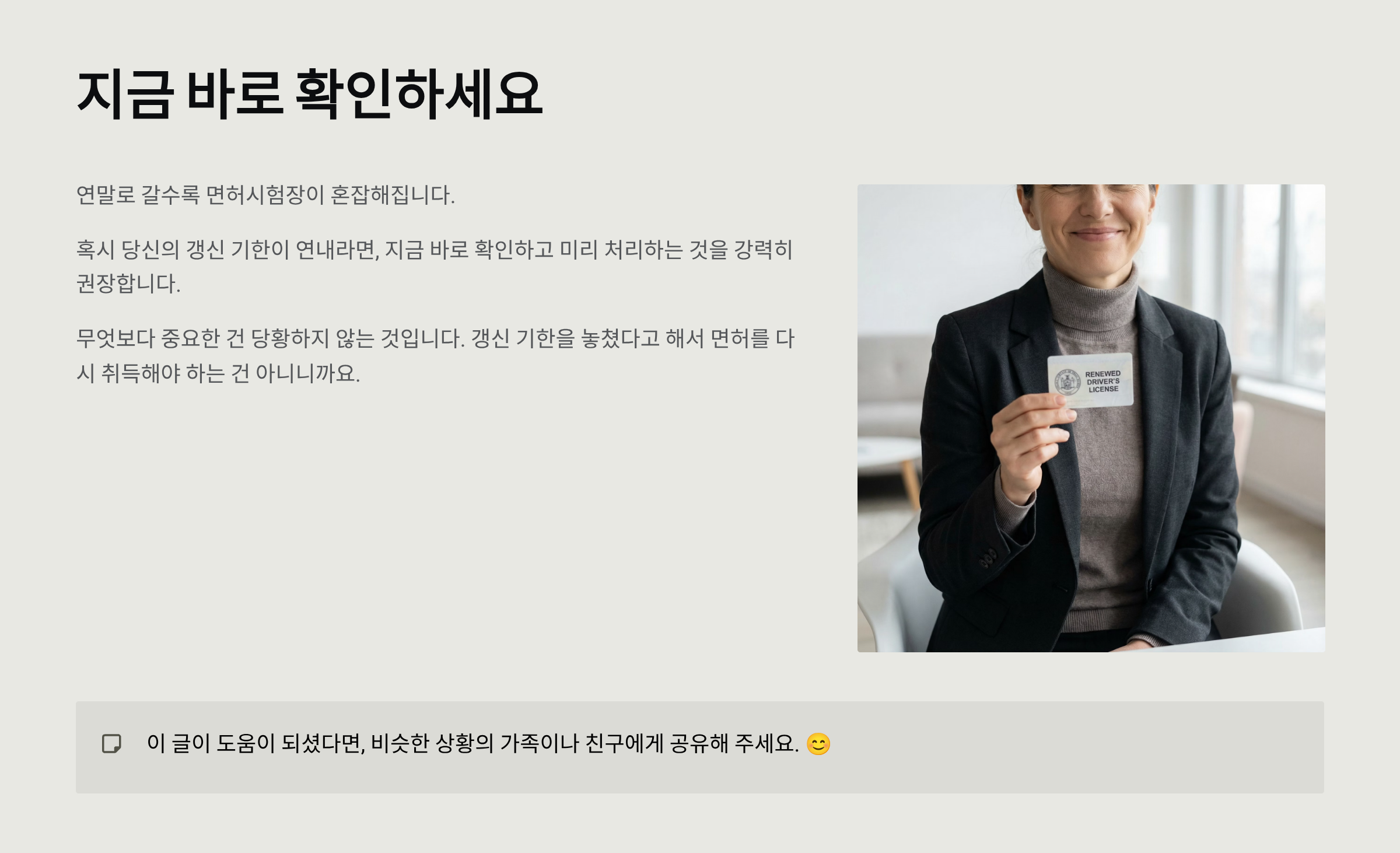 연말로 갈수록 면허시험장이 혼잡해집니다. 혹시 당신의 갱신 기한이 연내라면, 지금 바로 확인하고 미리 처리하는 것을 강력히 권장합니다. 무엇보다 중요한 건 당황하지 않는 것입니다. 갱신 기한을 놓쳤다고 해서 면허를 다시 취득해야 하는 건 아니니까요. 이 글이 도움이 되셨다면, 혹시 비슷한 상황의 가족이나 친구가 있을 때 공유해 주세요. 😊