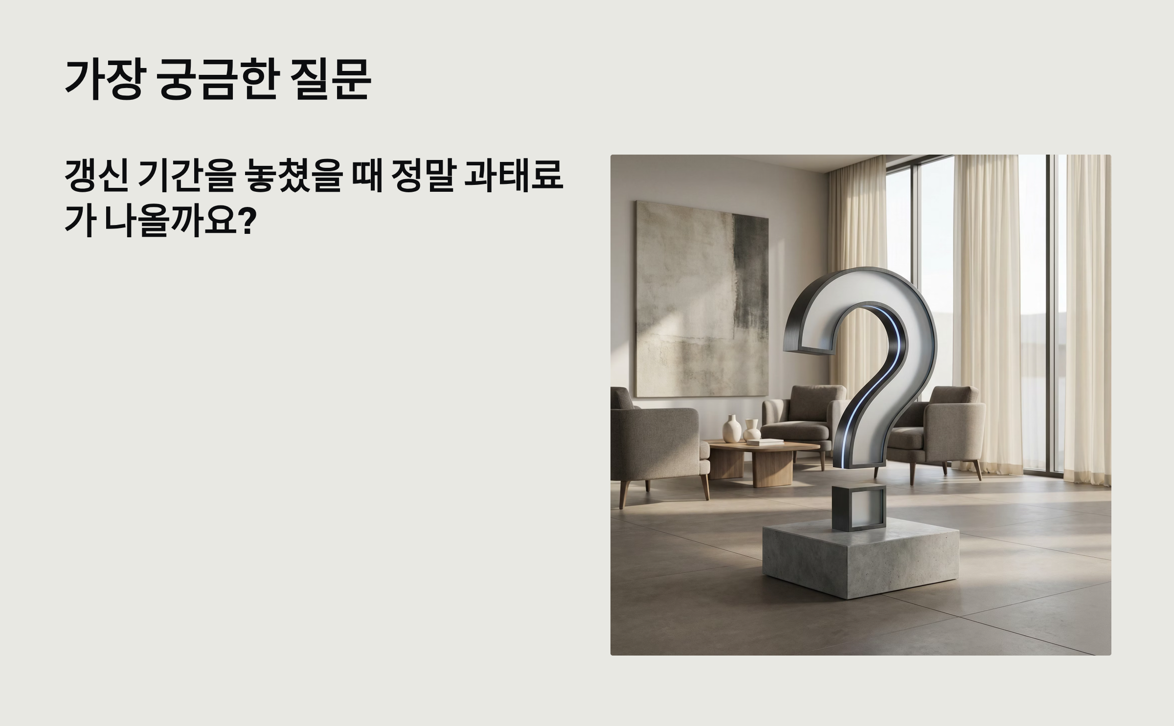 여기가 많은 분들이 궁금해하는 부분입니다. 갱신 기간을 놓쳤을 때 정말 과태료가 나올까요? 정확한 답변을 드리겠습니다.