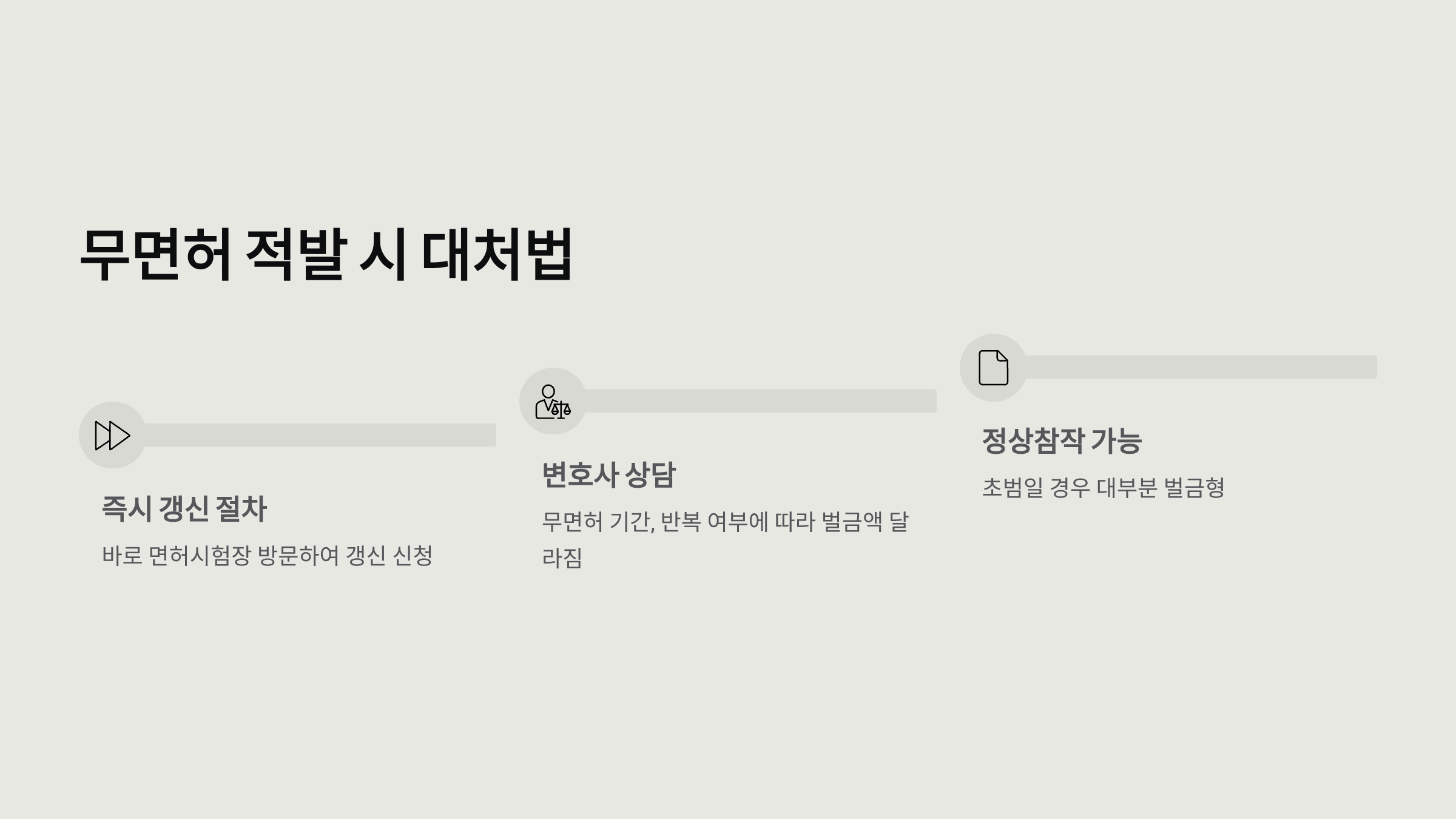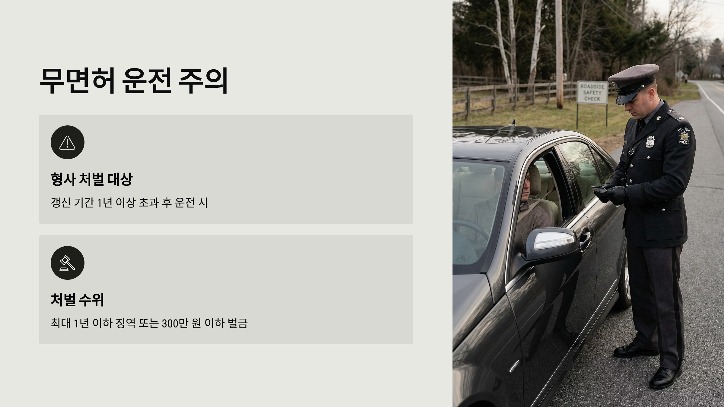 특히 주의할 점은 무면허 운전입니다. 만약 갱신 기간이 1년 이상 넘은 상태에서 운전을 하다가 경찰에 적발되면, 형사 처벌을 받게 됩니다. 최대 1년 이하의 징역 또는 300만 원 이하의 벌금에 처할 수 있습니다.