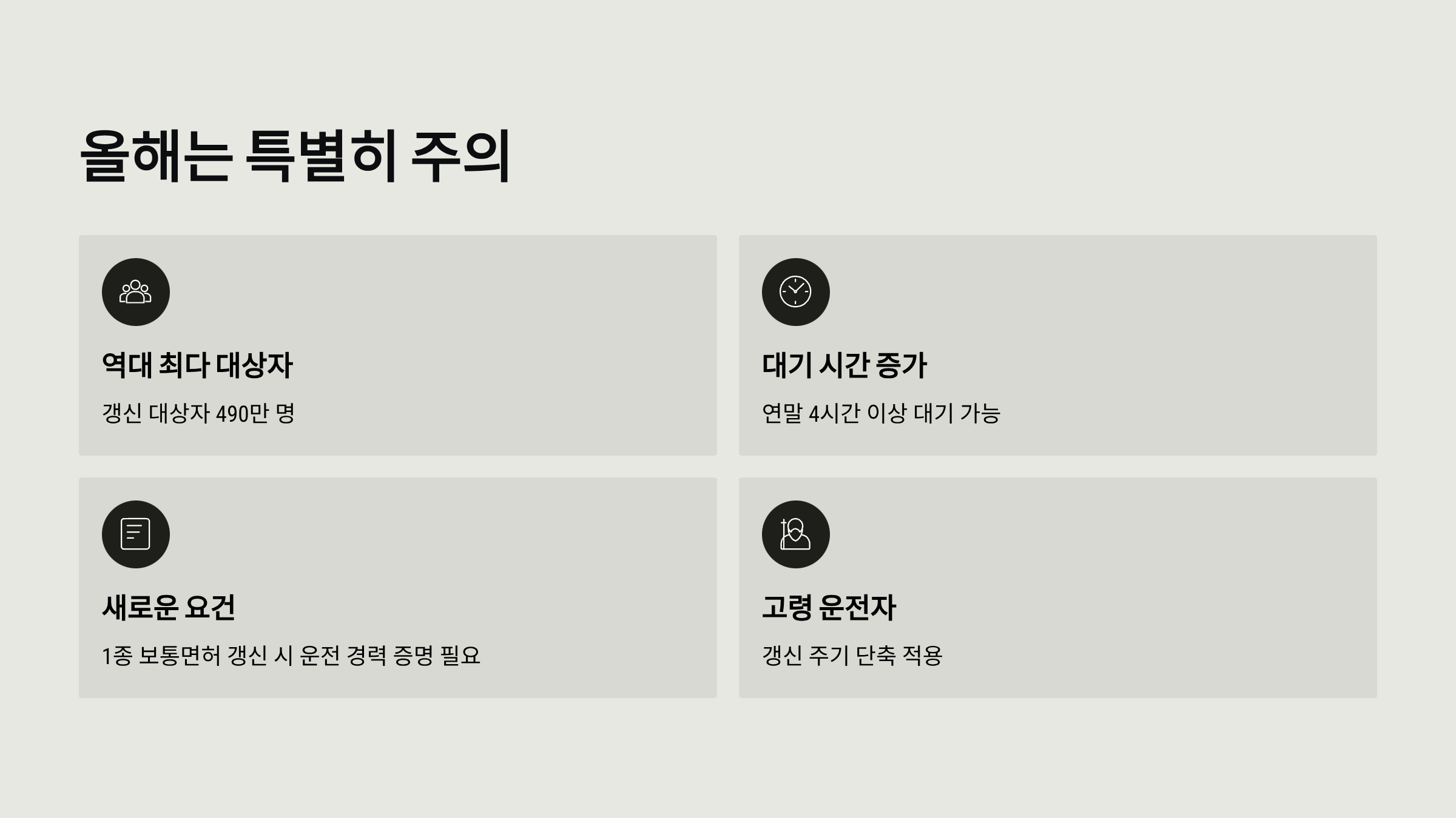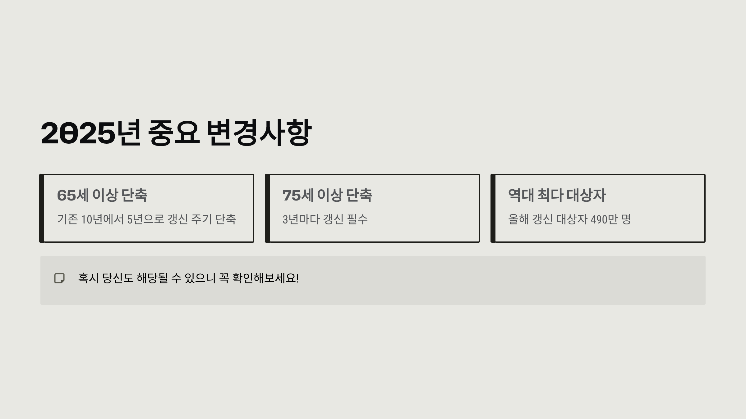 중요한 점: 2025년부터 65세 이상 운전자의 갱신 주기가 단축되었습니다. 기존에는 10년이었지만, 이제는 5년마다 갱신해야 하고, 75세 이상은 3년마다 갱신해야 합니다. 특히 올해 갱신 대상자가 490만 명으로 역대 최다를 기록한 만큼, 혹시 당신도 해당될 수 있으니 꼭 확인해보세요.