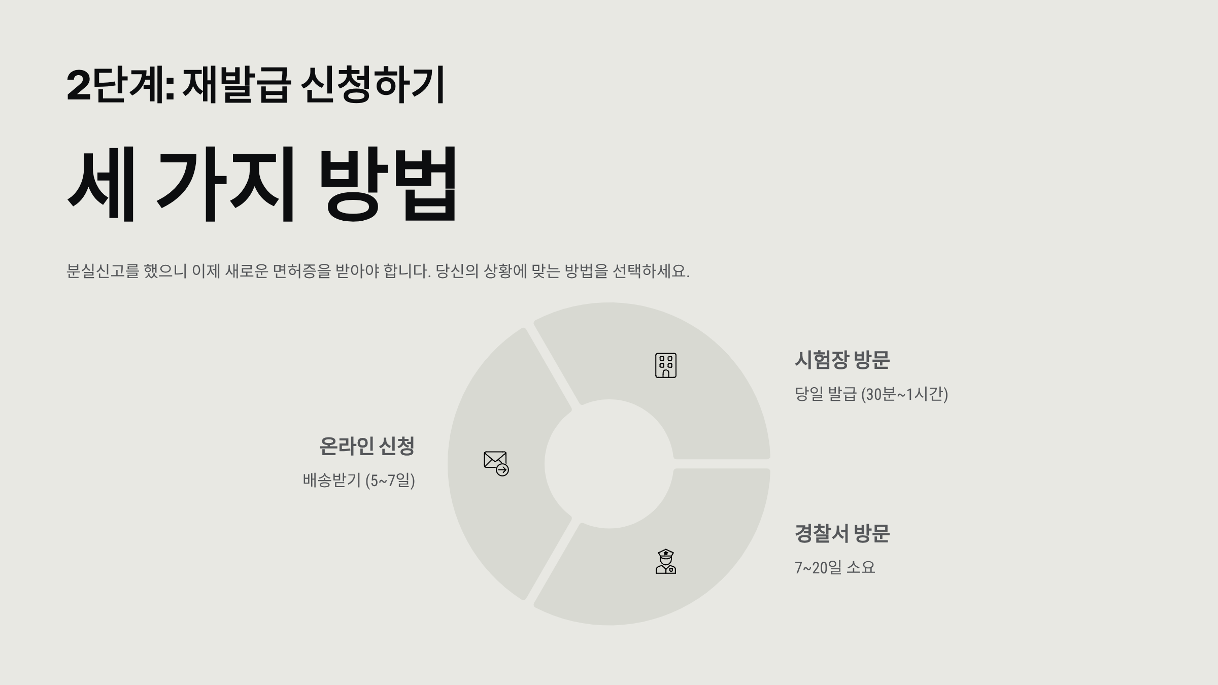 분실신고를 했으니 이제 새로운 면허증을 받아야 합니다. 세 가지 방법이 있습니다. 당신의 상황에 맞는 방법을 선택하세요.