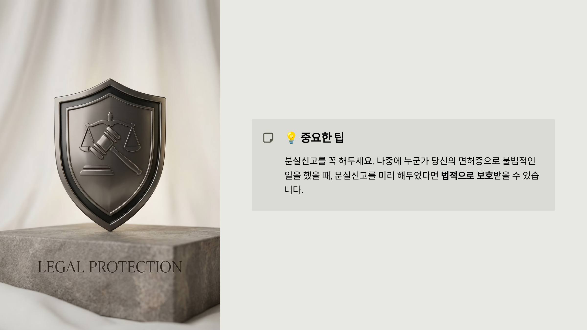 팁: 분실신고를 꼭 해두세요. 나중에 누군가 당신의 면허증으로 불법적인 일을 했을 때, 분실신고를 미리 해두었다면 법적으로 보호받을 수 있습니다.