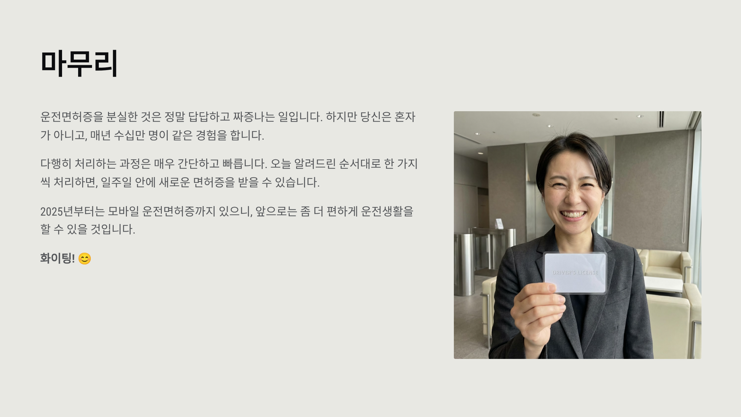 - 재발급받으면 모바일 면허증을 등록하세요: 2025년에는 IC칩이 내장되어 있으니, PASS 앱에 등록해두면 다음부터는 스마트폰만 들고 다녀도 됩니다. (완전히 안심은 금지!)