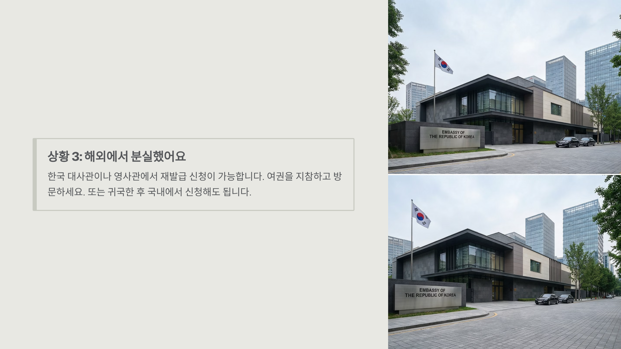 → 한국 대사관이나 영사관에서 재발급 신청이 가능합니다. 여권을 지참하고 방문하세요. 또는 귀국한 후 국내에서 신청해도 됩니다.