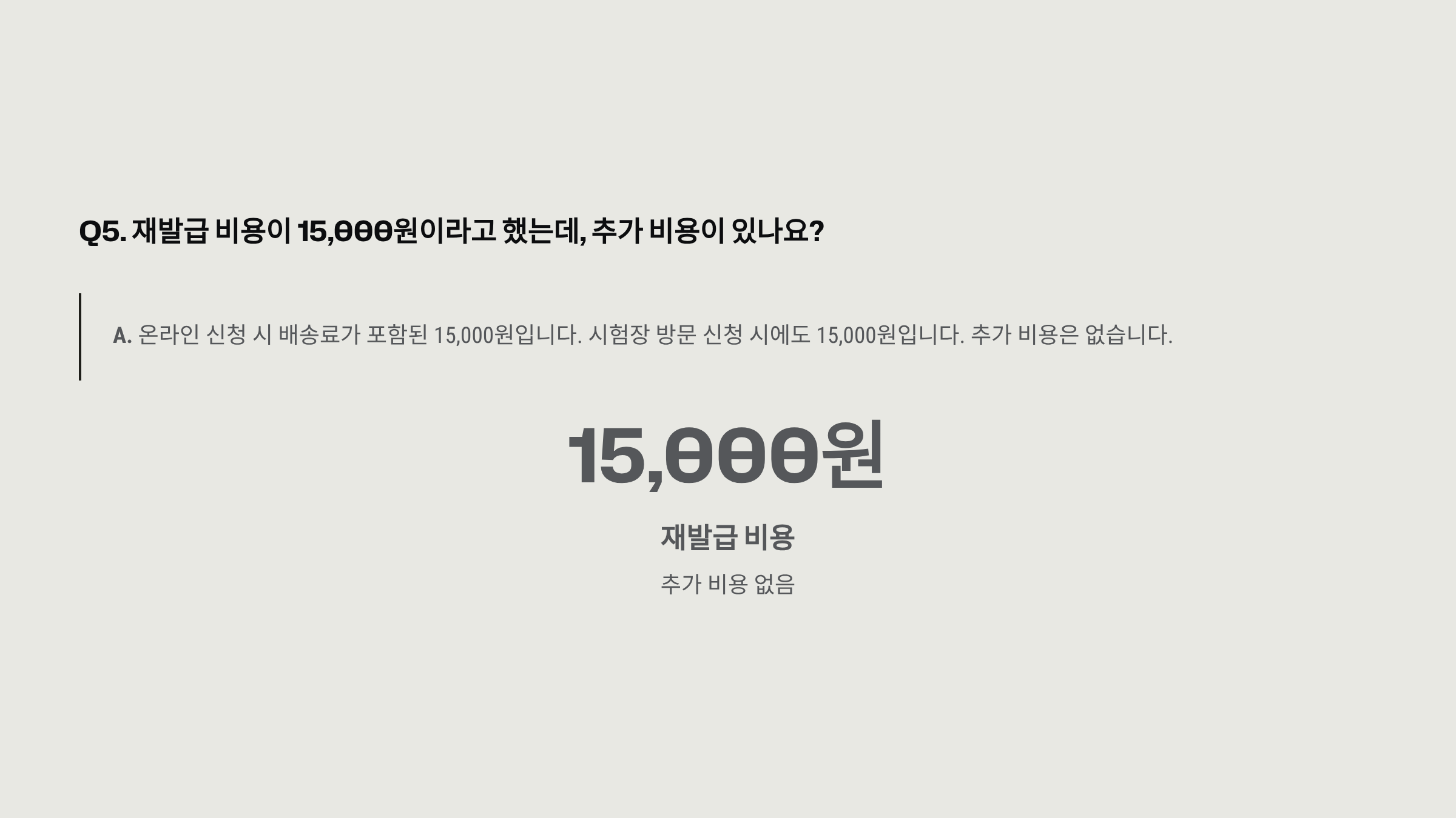 Q5. 재발급 비용이 15,000원이라고 했는데, 추가 비용이 있나요?