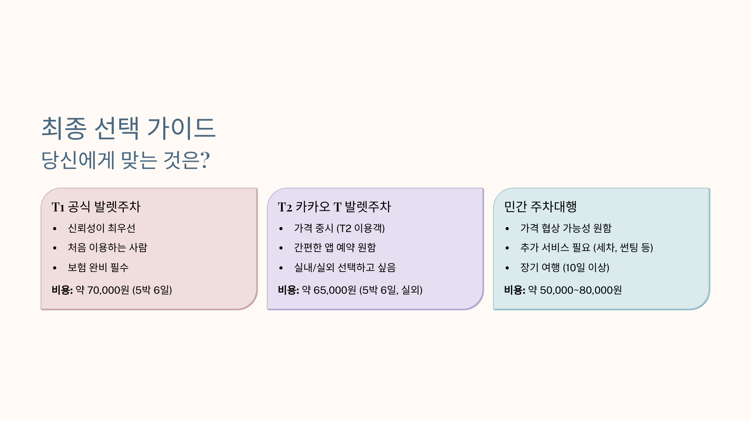첫 번째 발렛주차라면 공항 공식 업체 (T1 또는 T2)를 추천합니다. 신뢰성과 안정성이 보장되기 때문입니다. 일단 경험하고 나면, 다음부터는 가격과 편의성을 고려해서 민간 업체도 충분히 이용할 수 있습니다.