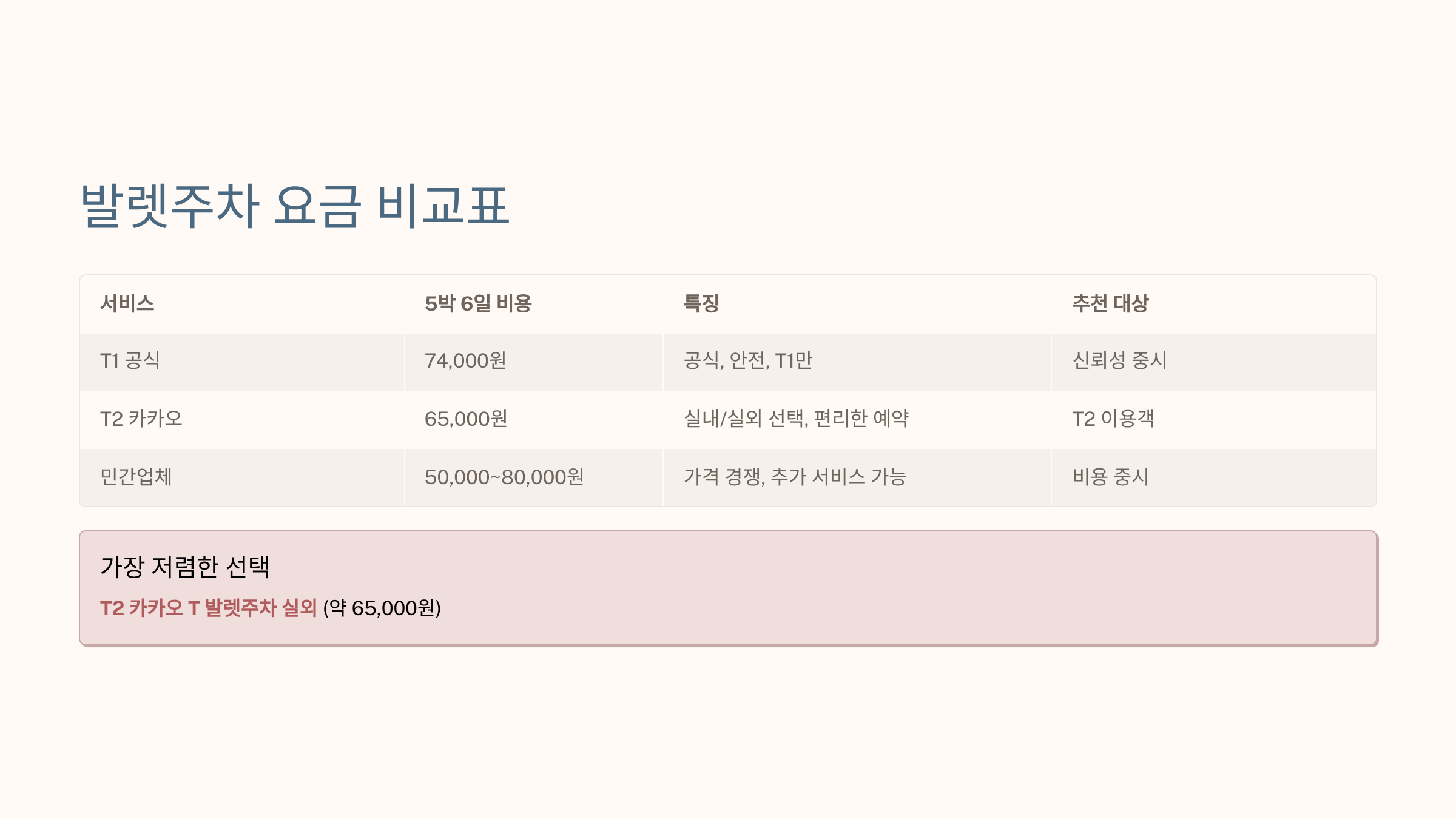 가장 저렴한 선택: T2 카카오 T 발렛주차 실외 (약 65,000원)