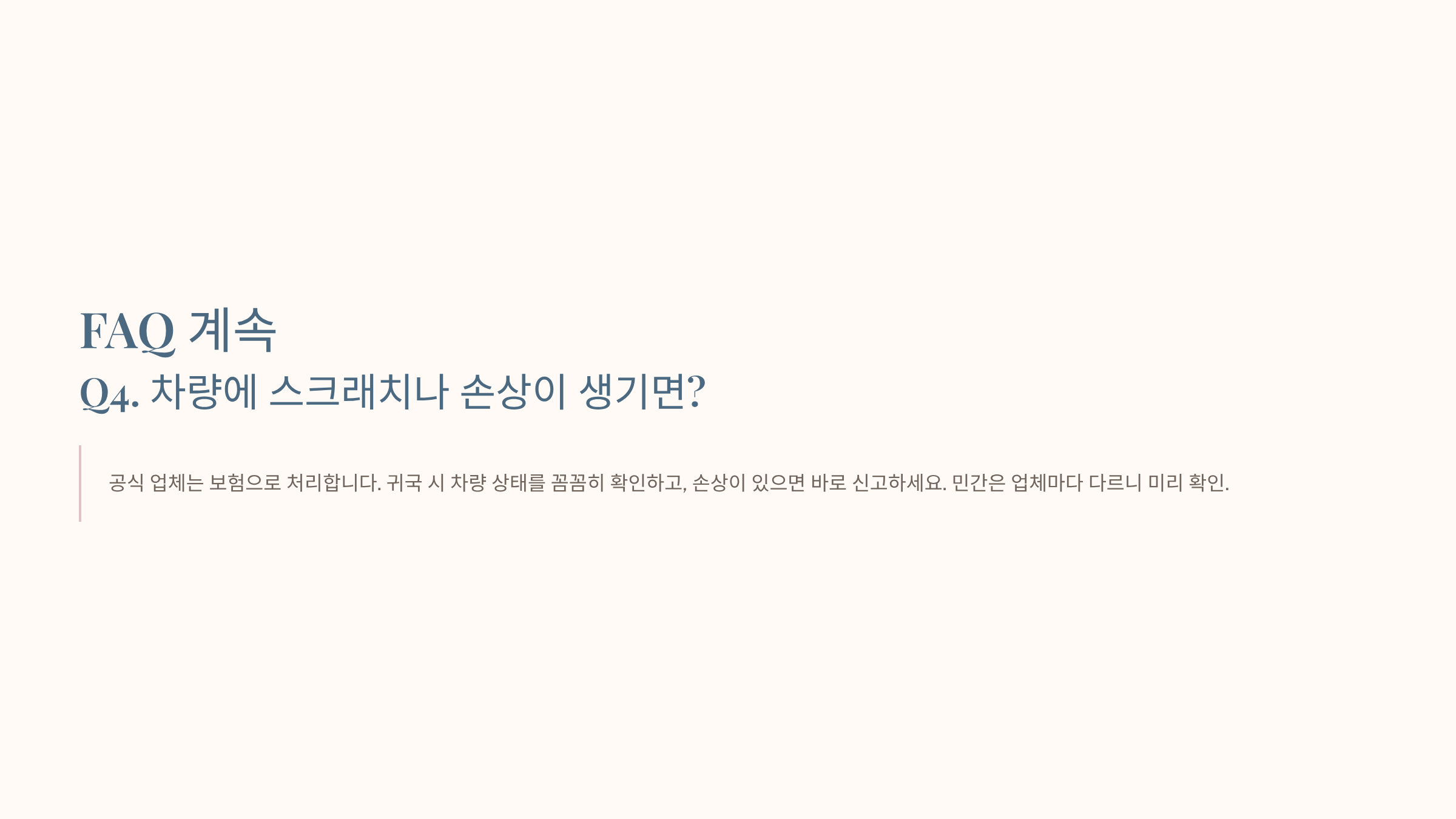 A. 공식 업체는 보험으로 처리합니다. 귀국 시 차량 상태를 꼼꼼히 확인하고, 손상이 있으면 바로 신고하세요. 민간은 업체마다 다르니 미리 확인.
