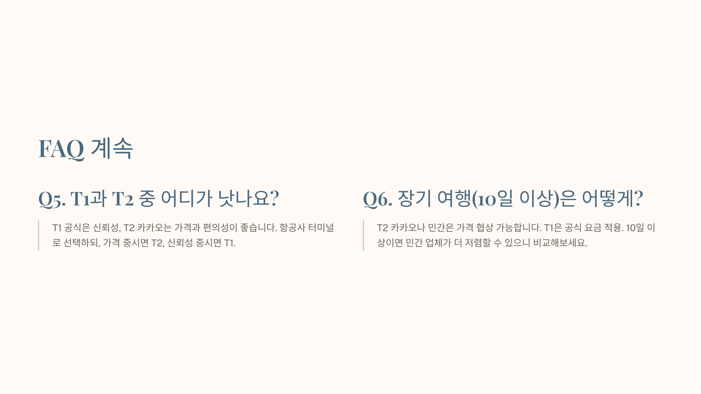 A. T1 공식은 신뢰성, T2 카카오는 가격과 편의성이 좋습니다. 항공사 터미널로 선택하되, 가격 중시면 T2, 신뢰성 중시면 T1.