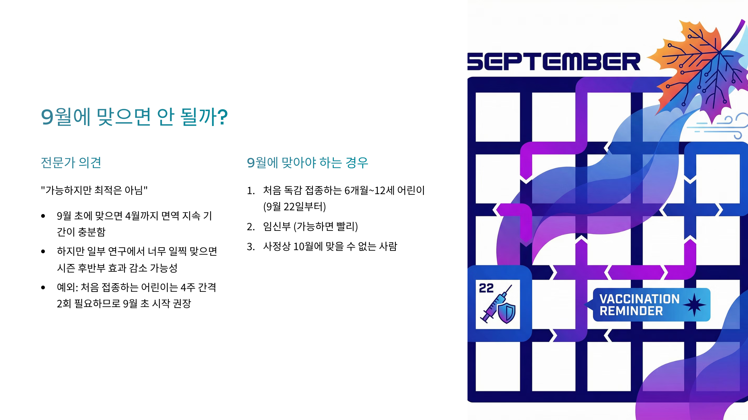 - 9월 초에 맞으면 4월까지 면역 지속 기간이 충분함