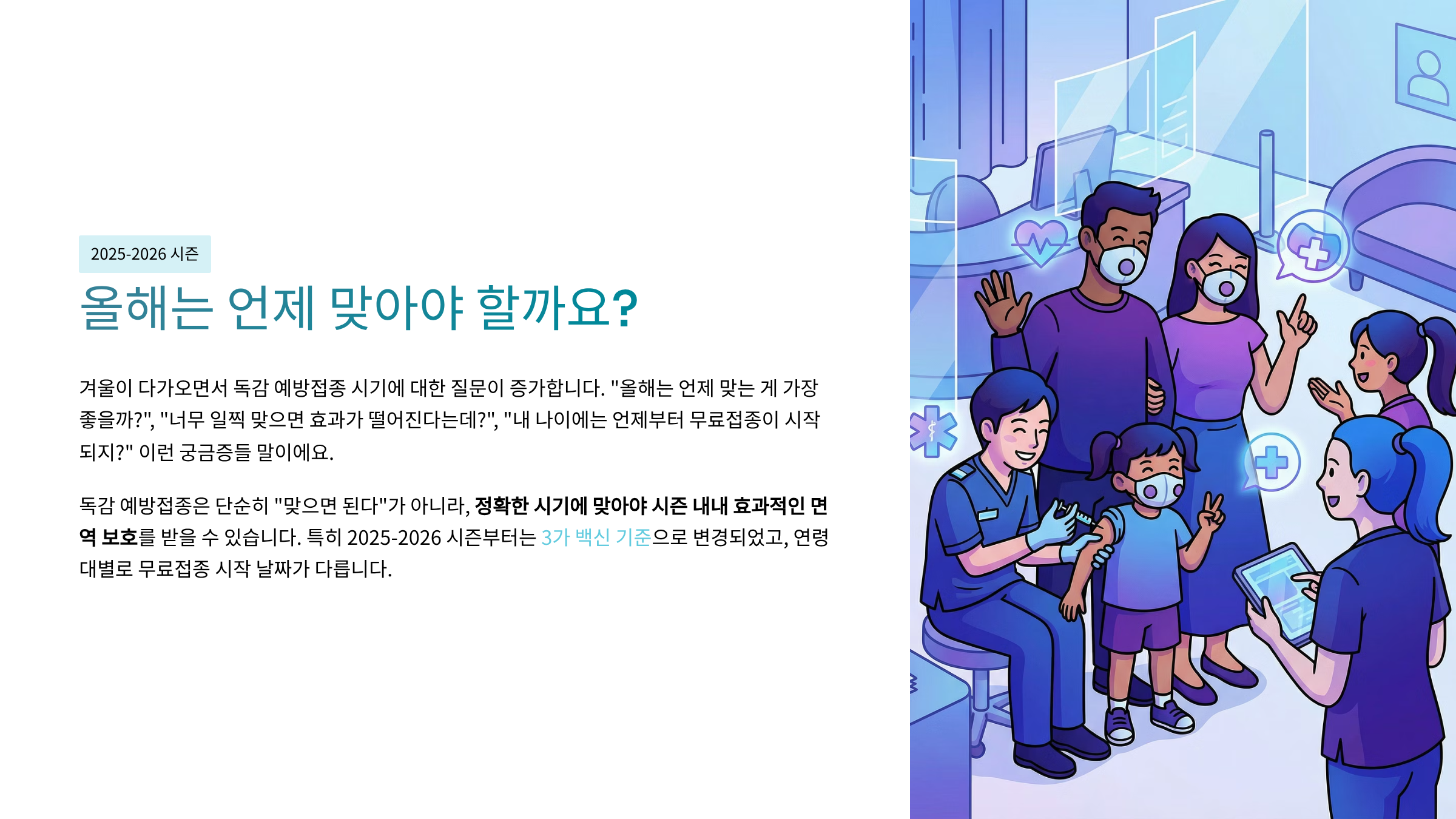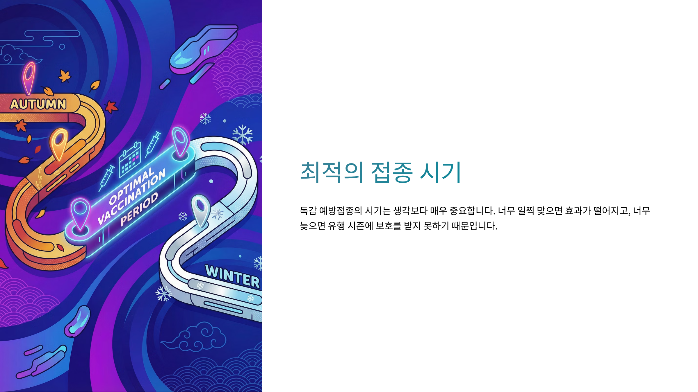 독감 예방접종은 "맞는 것" 그 자체도 중요하지만, **"제때 맞는 것"**이 더 중요합니다.