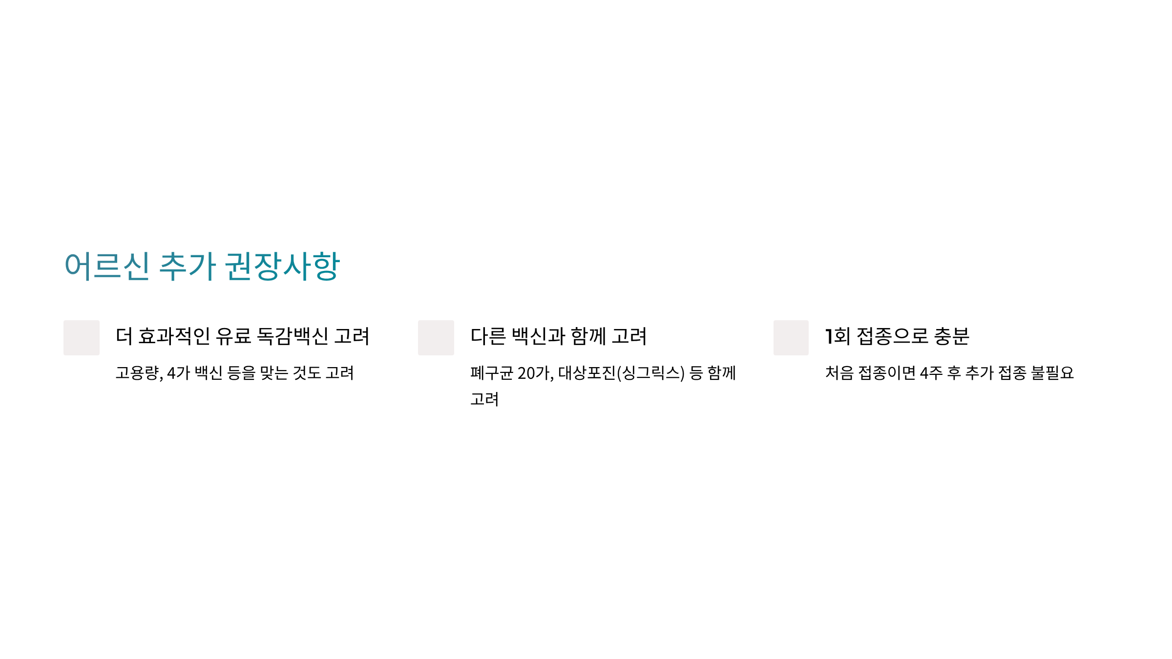 - 폐구균 20가, 대상포진(싱그릭스) 등 함께 고려