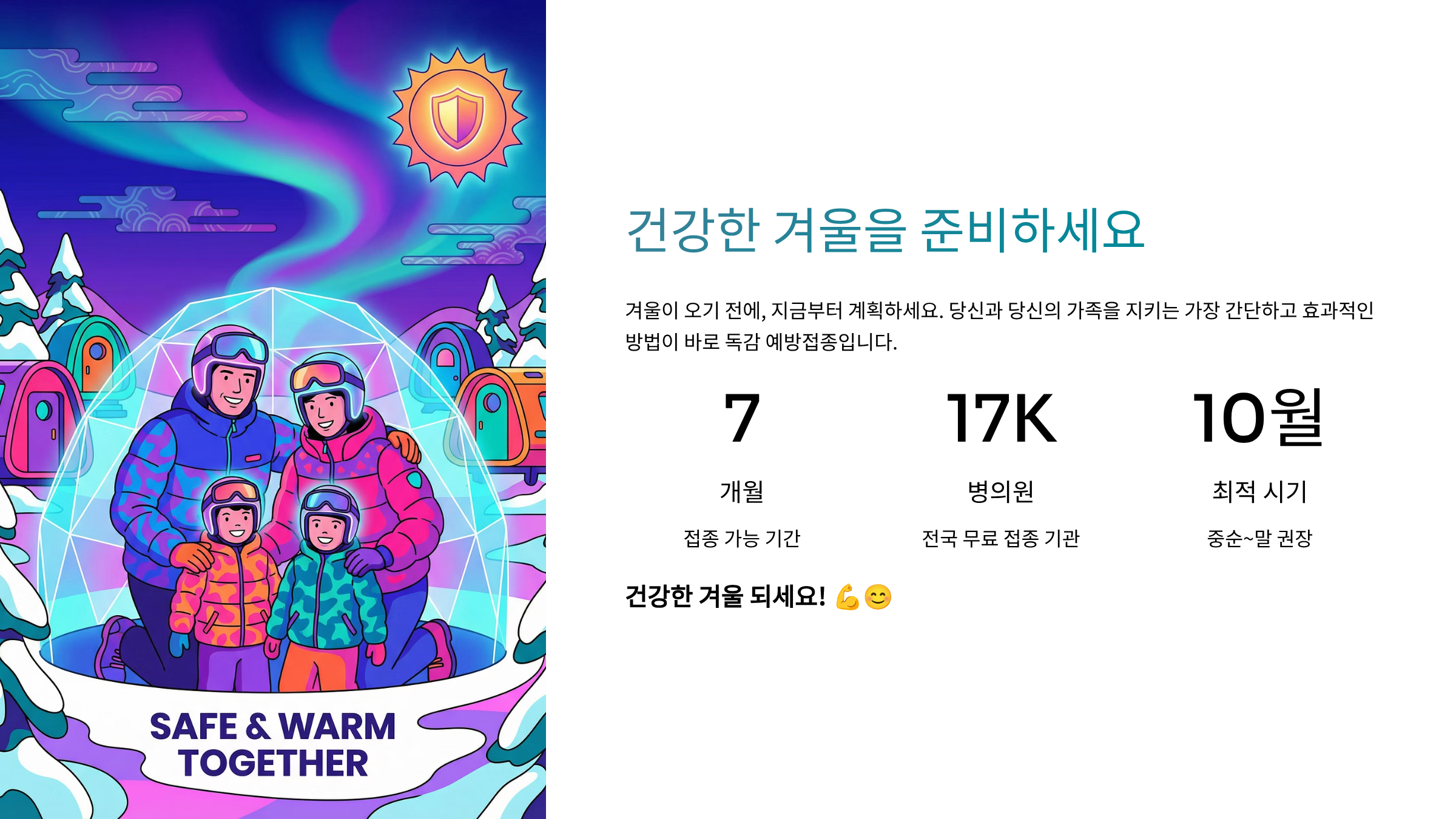 겨울이 오기 전에, 지금부터 계획하세요. 당신과 당신의 가족을 지키는 가장 간단하고 효과적인 방법이 바로 독감 예방접종입니다. 건강한 겨울 되세요! 💪😊