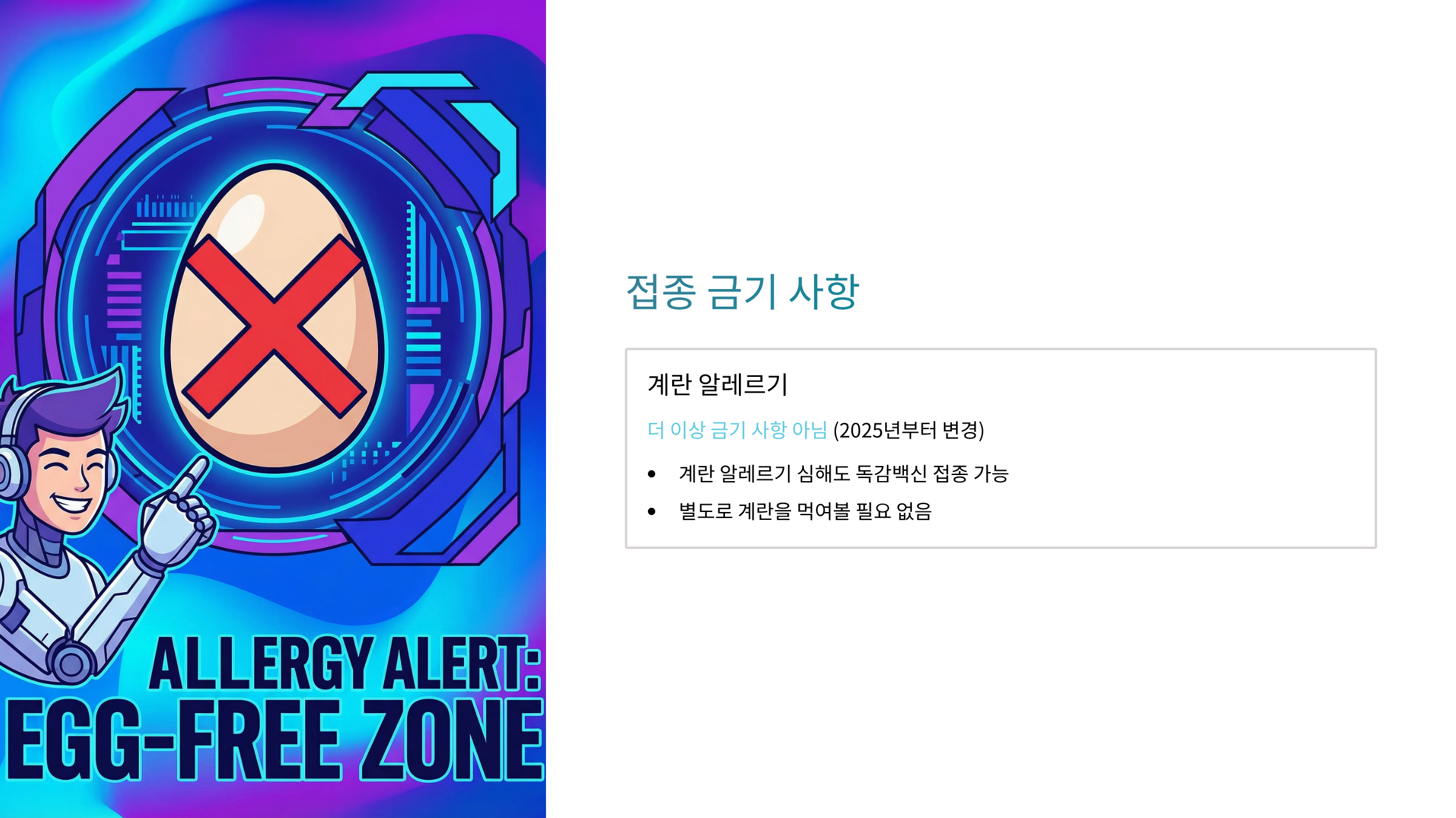 A. 아닙니다. 2025년부터는 계란 알레르기가 금기사항에서 제외되었습니다. 계란 알레르기가 심해도 독감백신 접종 가능합니다.
