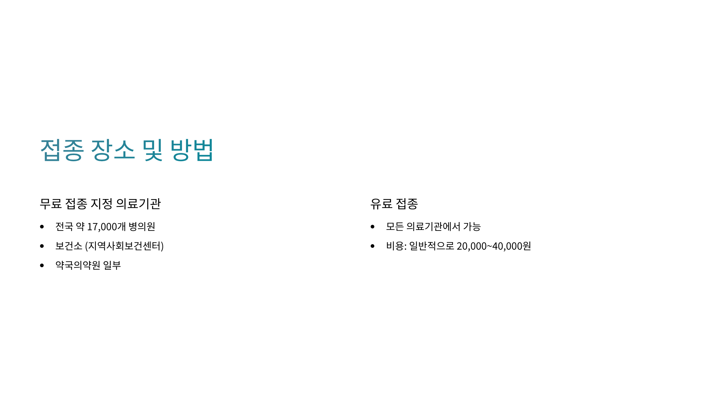 - 무료 접종: 사전 예약 필수 (병원/보건소별로 다름)