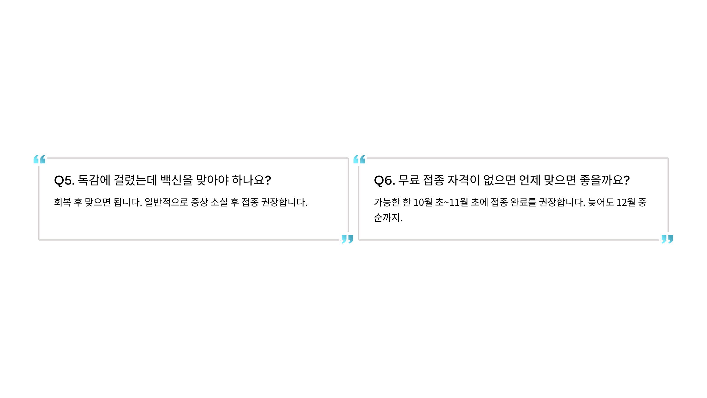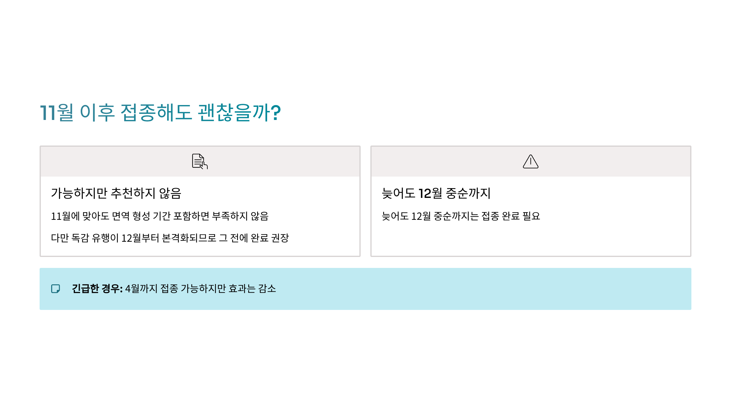 A. 가능한 한 10월 초~11월 초에 접종 완료를 권장합니다. 늦어도 12월 중순까지.