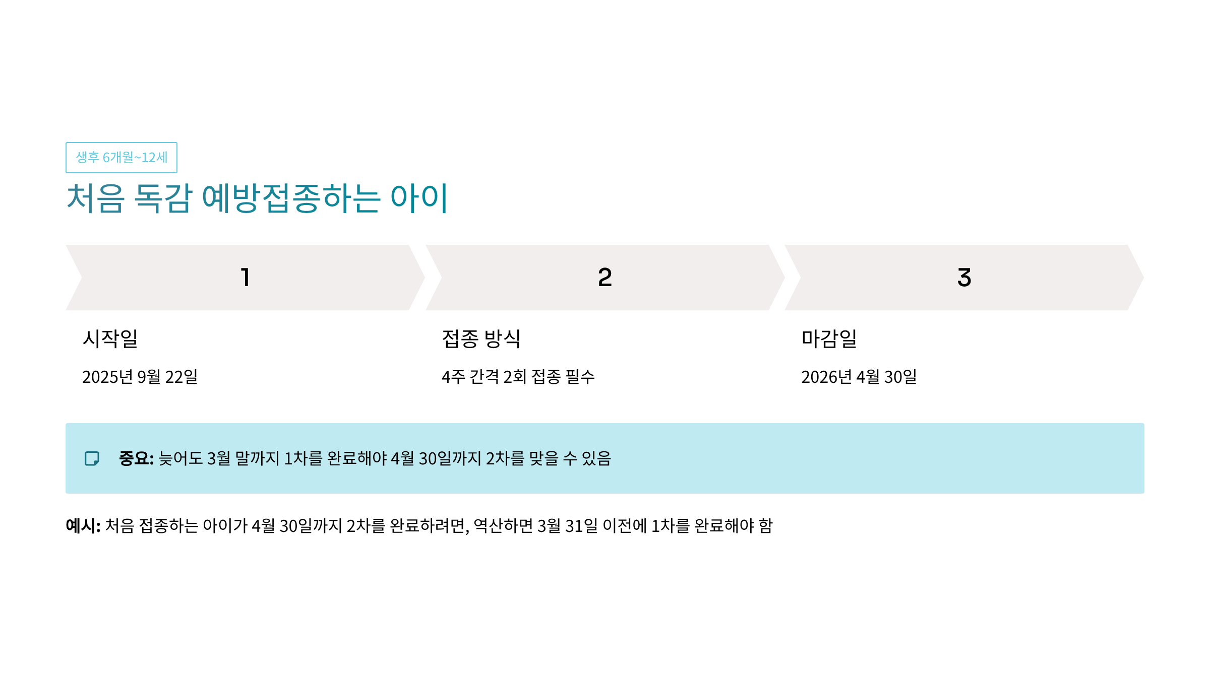 - 생후 6개월~12세 아동 (처음 접종): 9월 22일