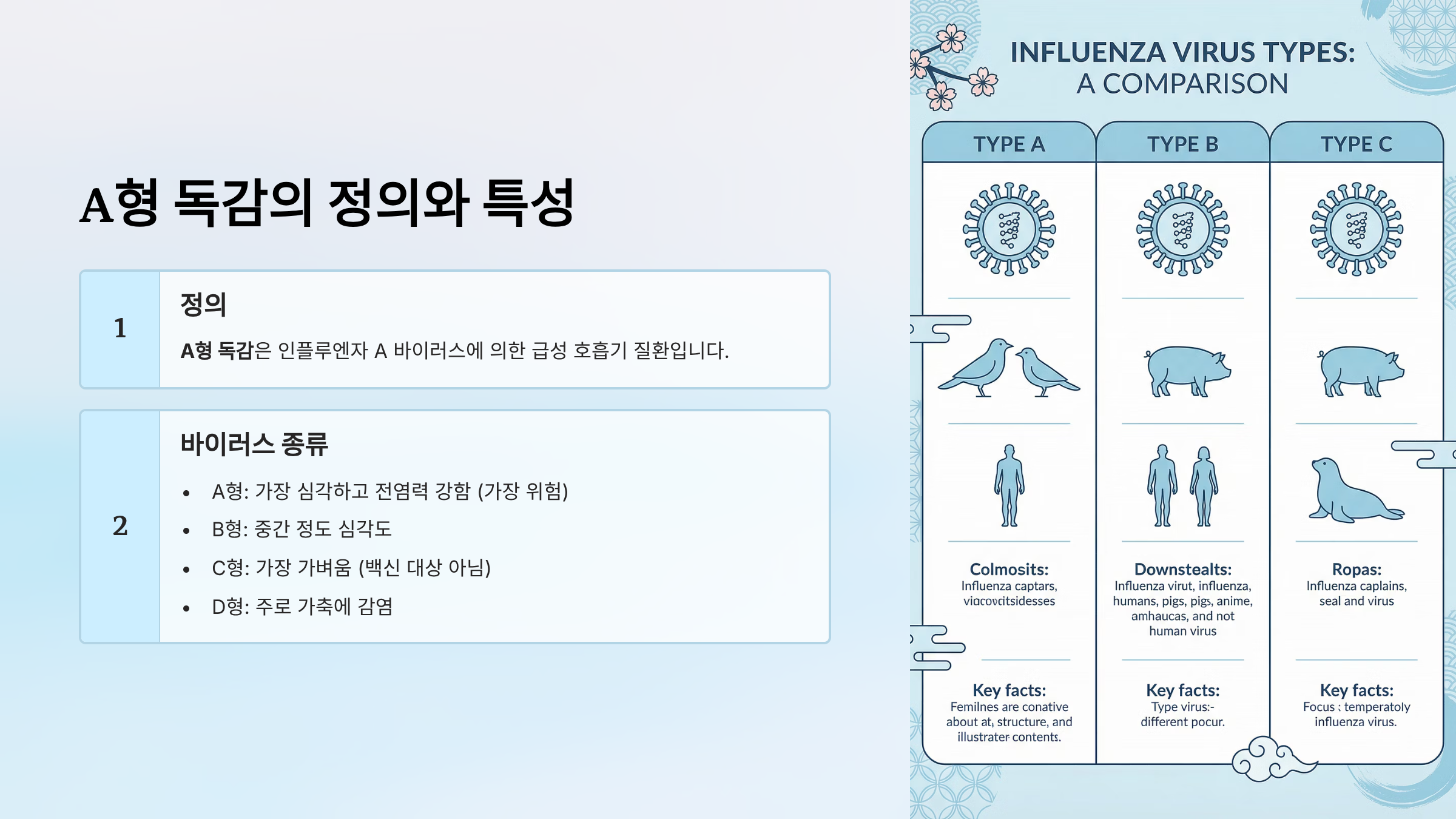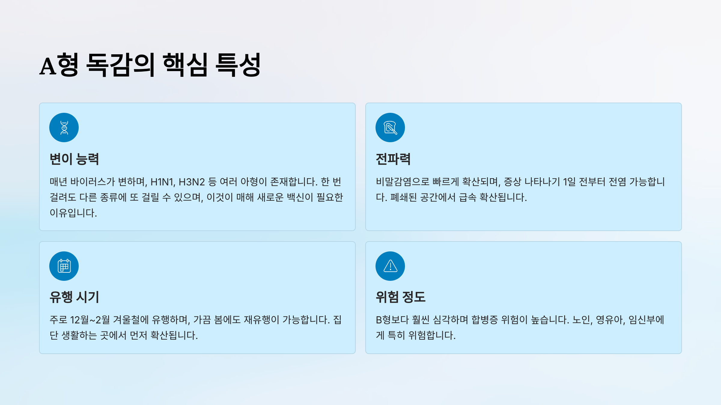 겨울철이 되면 뉴스에서 가장 자주 들리는 단어는 단연코 "독감"입니다. 그 중에서도 가장 위험한 것으로 불리는 것이 A형 독감입니다. "A형 독감 환자 급증", "A형 독감으로 인한 입원 환자 증가", "합병증 주의" 같은 뉴스 헤드라인이 계속되는데, 정확히 A형 독감이 어떤 증상을 일으키는지 모르는 사람들이 많습니다. 감기라고 생각했다가 나중에 병원 검사를 받아보니 A형 독감이었다는 사례도 흔합니다. 하지만 그때는 이미 증상 발현 48시간이 지나서 항바이러스제의 효과를 제대로 못 받는 경우가 많습니다. 오늘은 A형 독감의 정확한 증상, 감기와의 차이점, 신속한 대처 방법을 완벽하게 정리해드리겠습니다. 지금 읽은 정보가 당신과 가족의 건강을 지키는 첫걸음이 될 것입니다. 😊