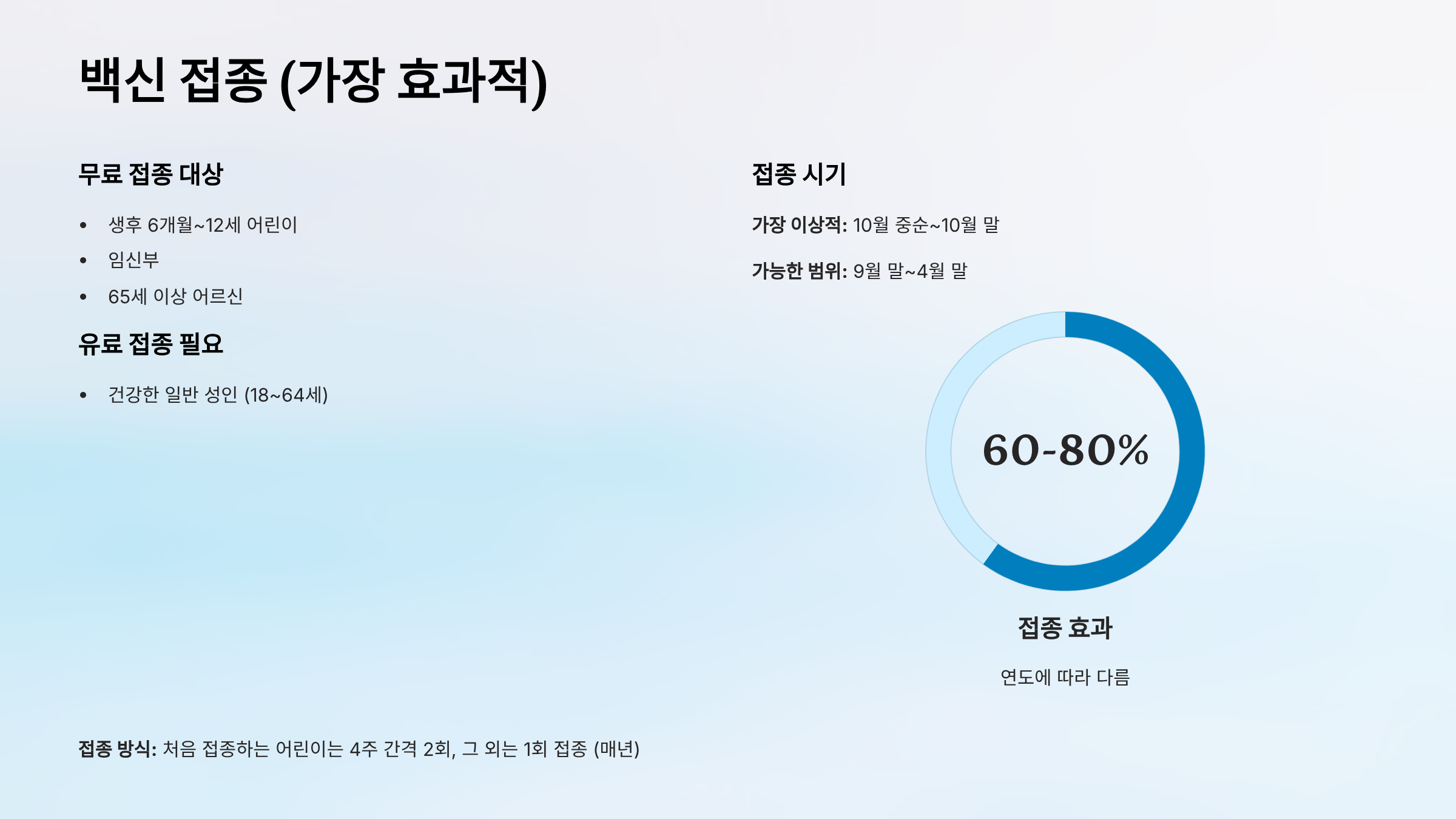 - 접종 효과: 60~80% (연도에 따라 다름)