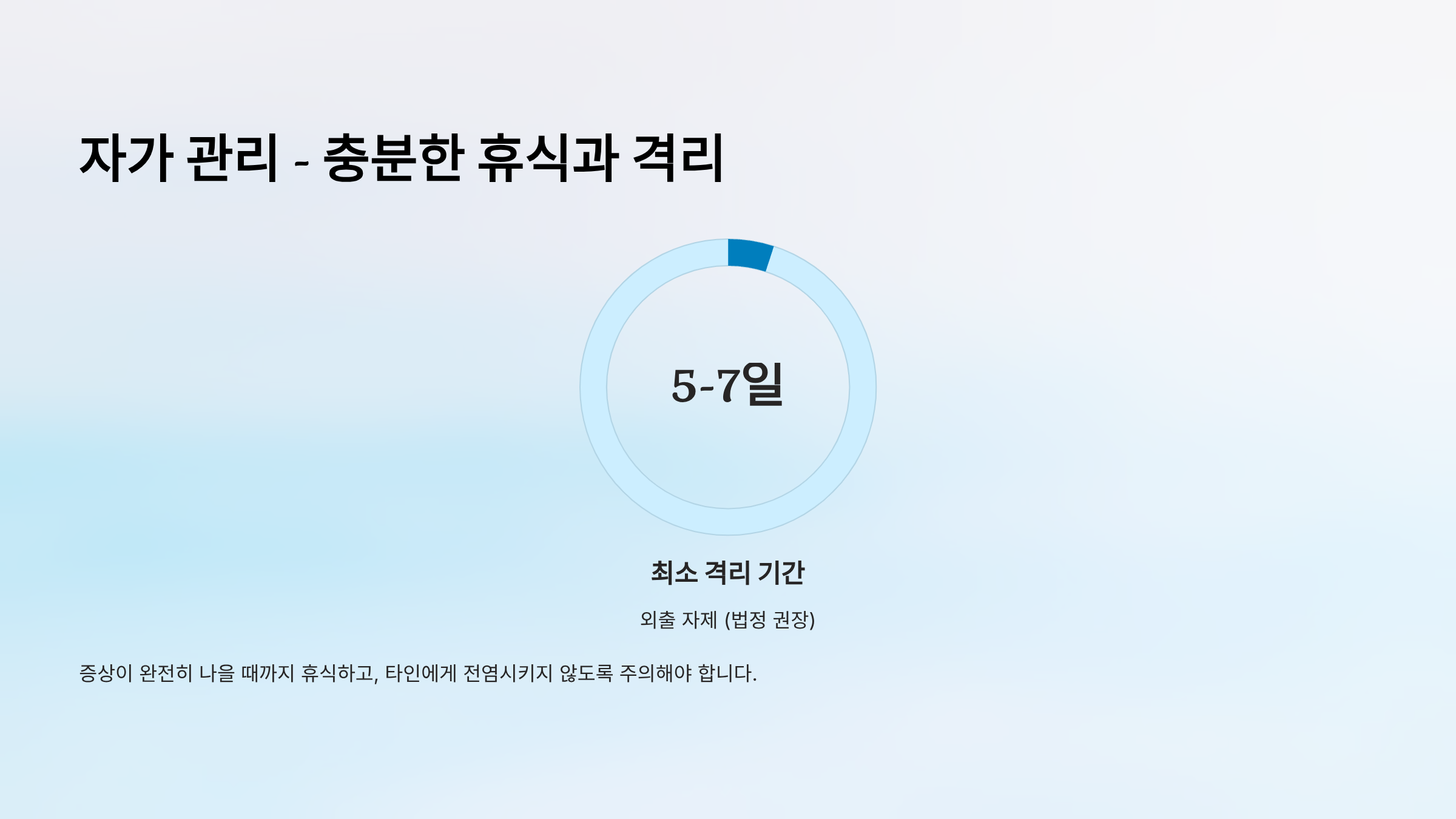 A. 최소 5~7일을 쉬는 것이 권장됩니다 (법정 기준). 완전히 회복되기 전에 출근하면 타인에게 전염시킬 수 있습니다.