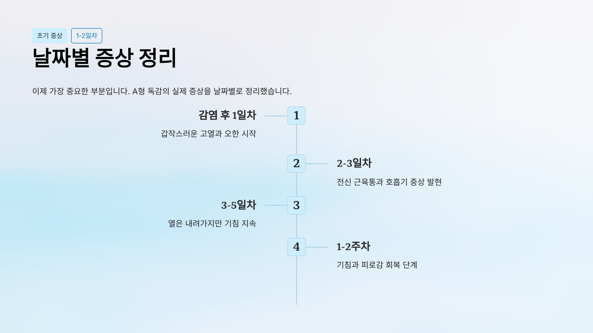 이제 가장 중요한 부분입니다. A형 독감의 실제 증상을 날짜별로 정리했습니다.