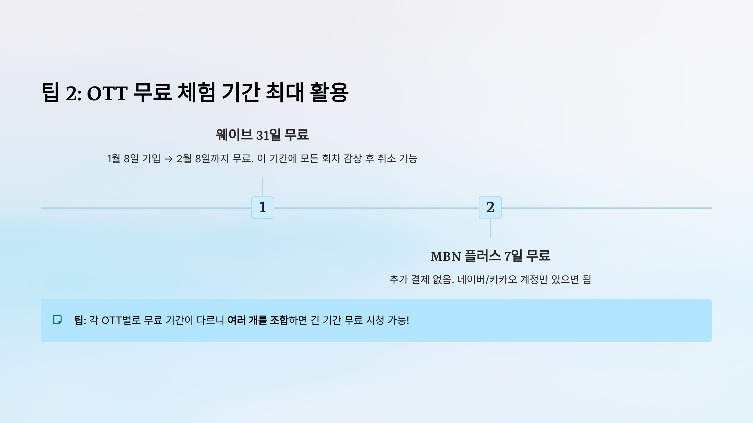 팁: 각 OTT별로 무료 기간이 다르니 여러 개를 조합하면 긴 기간 무료 시청 가능!