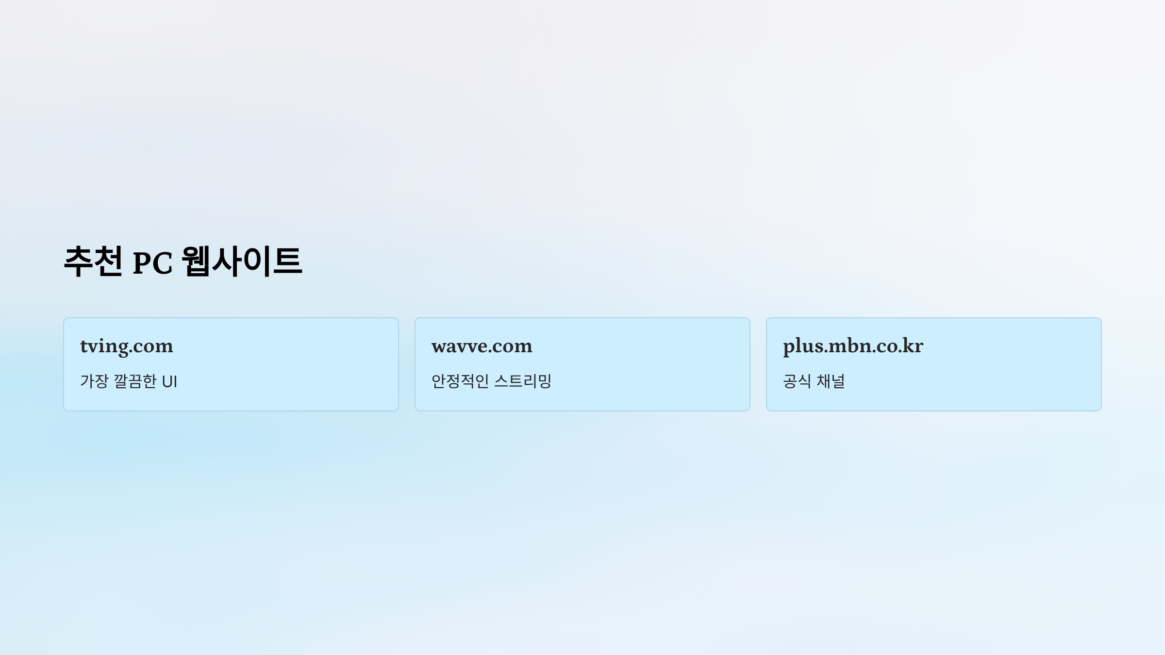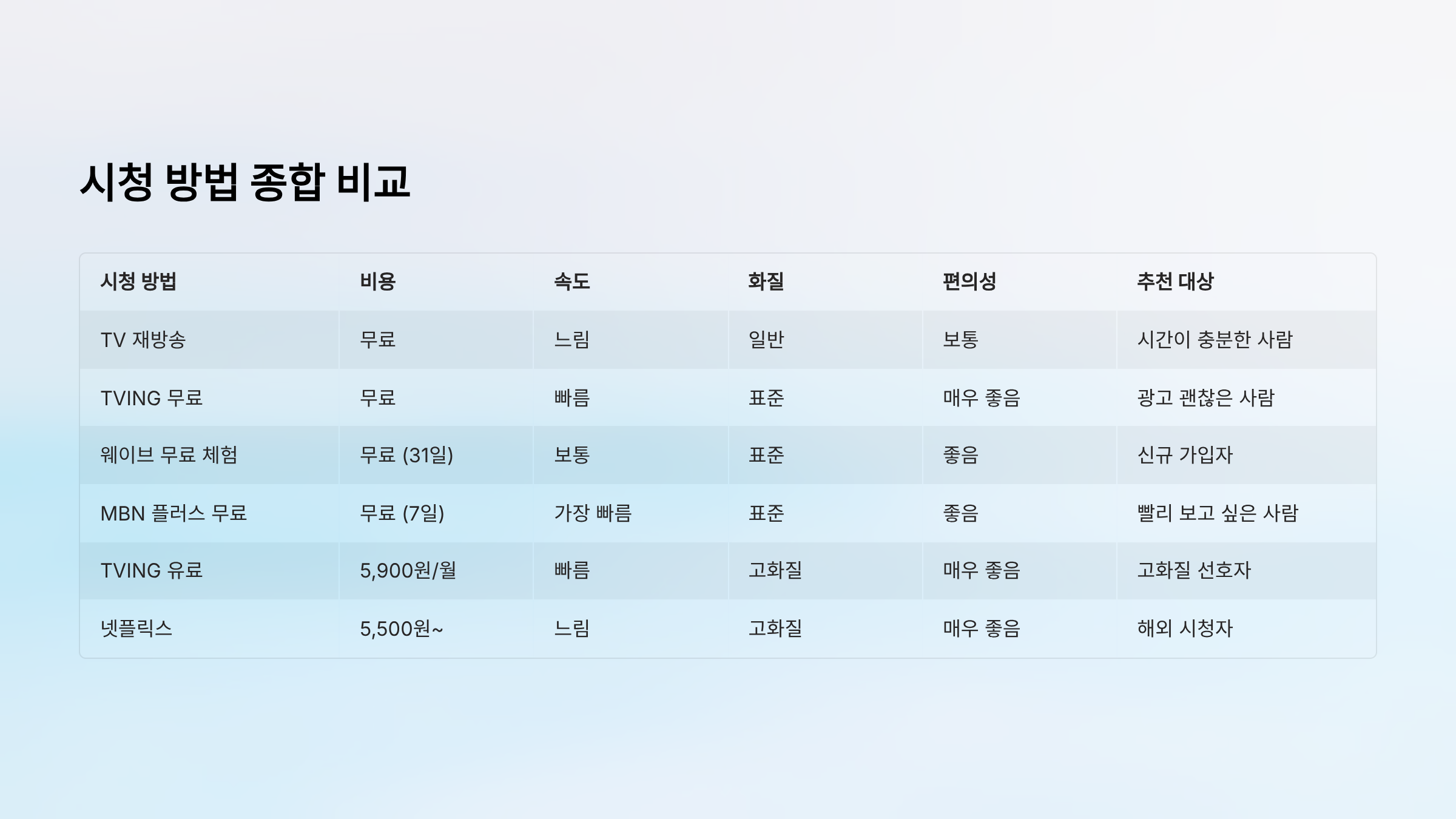 | MBN 플러스 무료 | 무료 (7일) | 가장 빠름 | 표준 | 좋음 | 빨리 보고 싶은 사람 |