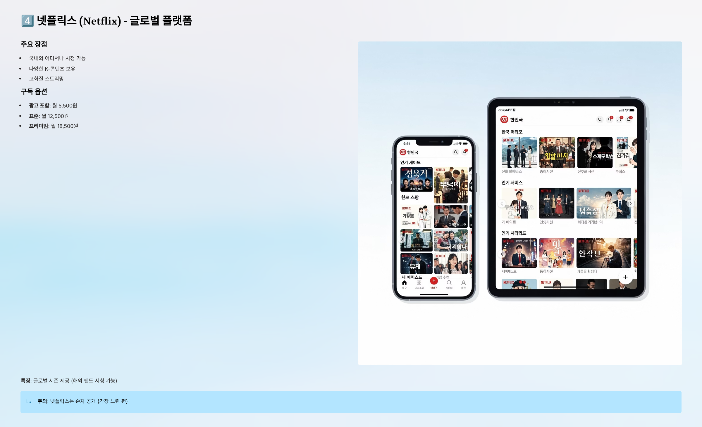 | 넷플릭스 | 5,500원~ | 느림 (순차) | 고화질 | 매우 좋음 | 해외 시청자 |