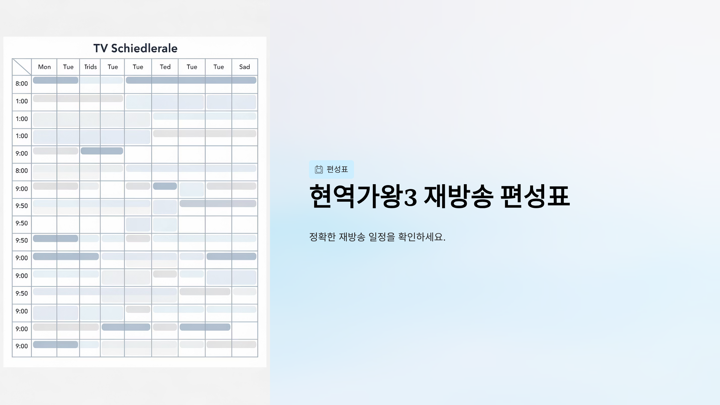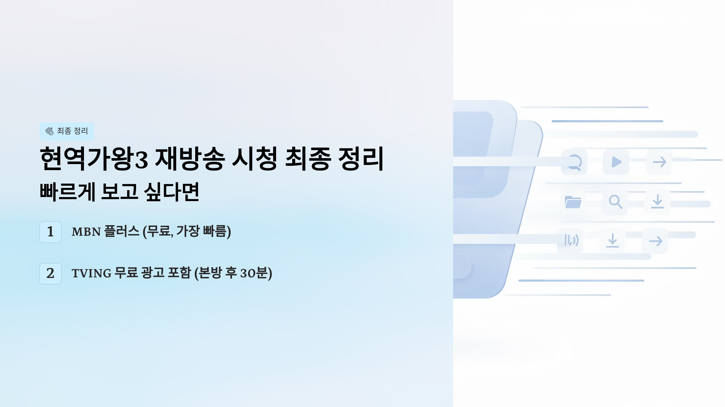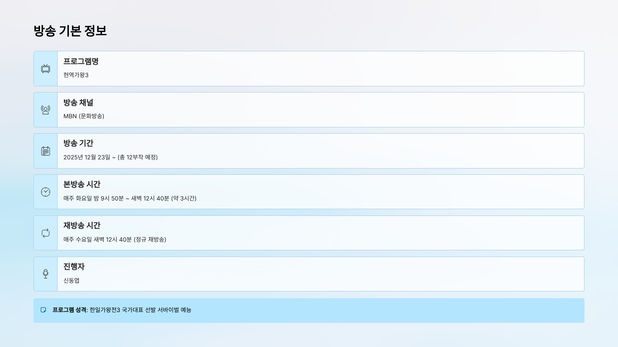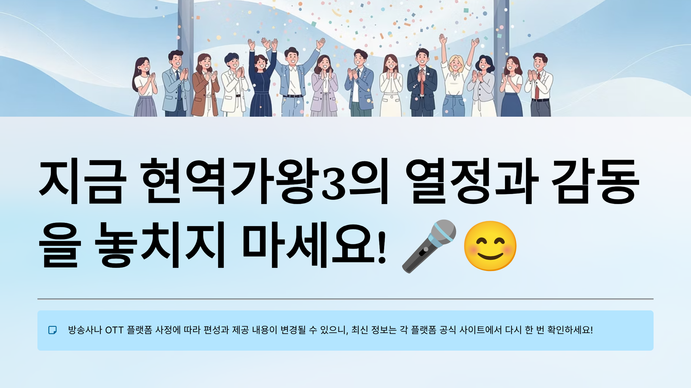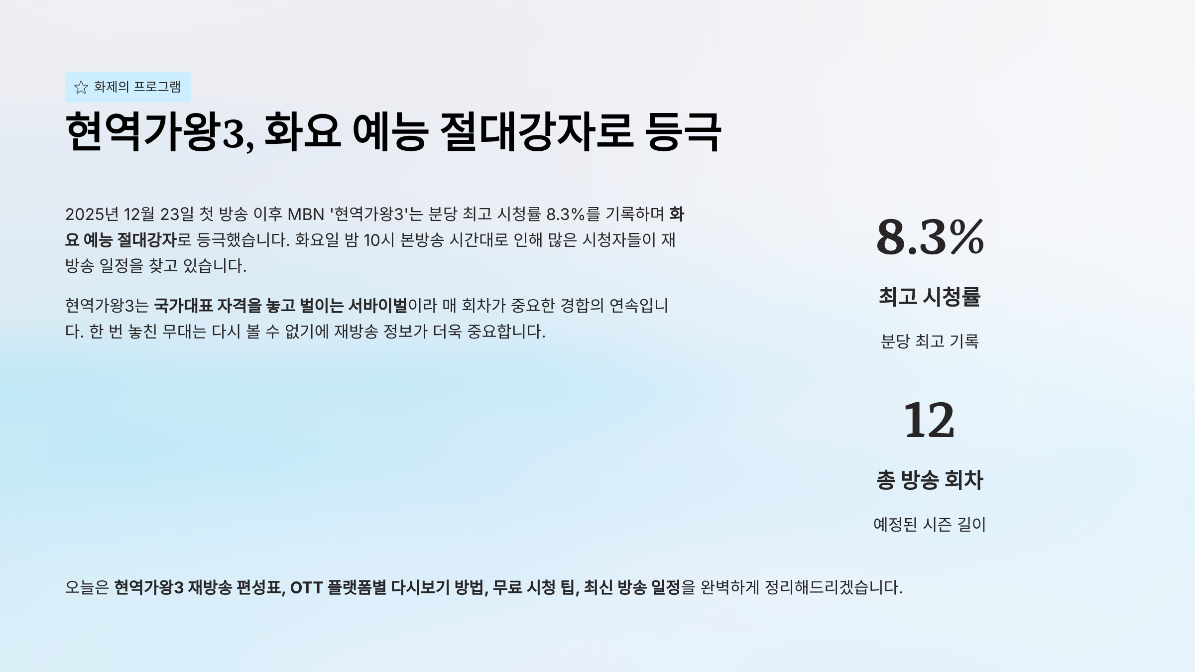 2025년 12월 23일 첫 방송 이후 MBN '현역가왕3'는 분당 최고 시청률 8.3%를 기록하며 화요 예능 절대강자로 등극했습니다. 하지만 화요일 밤 10시에 본방송이 되기 때문에 "일정 때문에 못 봤는데 언제 다시 볼 수 있을까?"라는 질문이 끊이지 않습니다. 더군다나 현역가왕3는 국가대표 자격을 놓고 벌이는 서바이벌이라 매 회차가 중요한 경합의 연속입니다. 한 번 놓친 무대는 다시 볼 수 없습니다. 오늘은 현역가왕3 재방송 편성표, OTT 플랫폼별 다시보기 방법, 무료 시청 팁, 최신 방송 일정을 완벽하게 정리해드리겠습니다. 지금부터 당신이 원하는 시간에, 원하는 방식으로 현역가왕3를 시청하세요. 😊