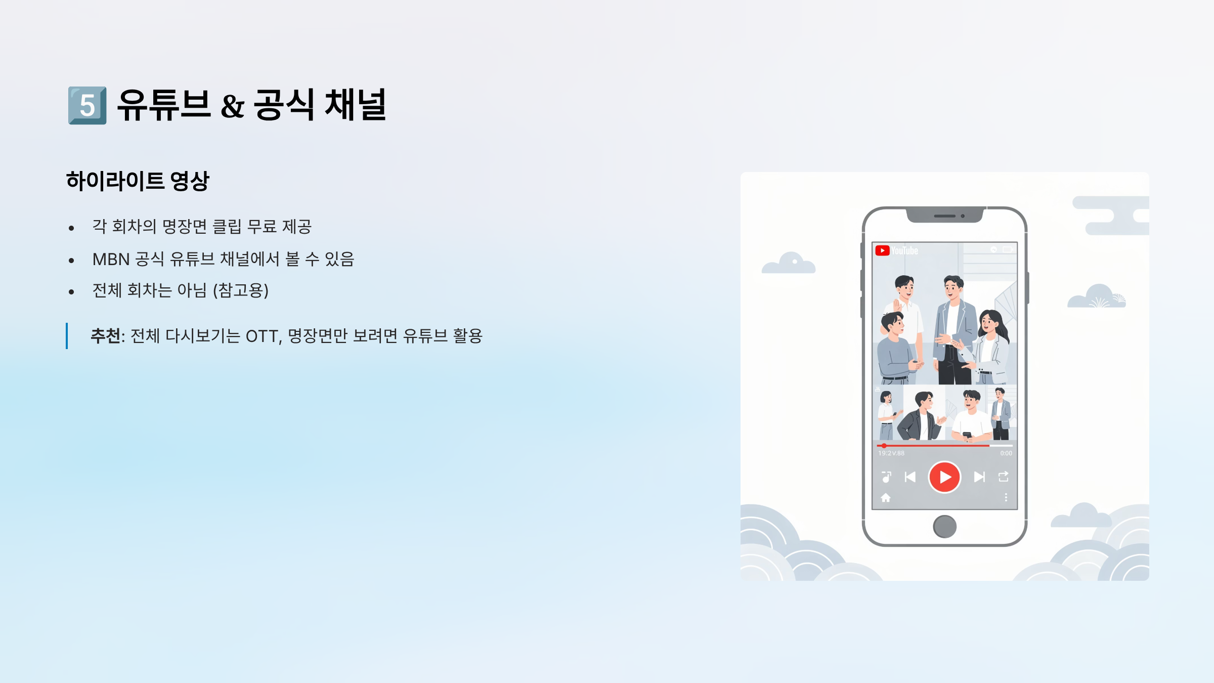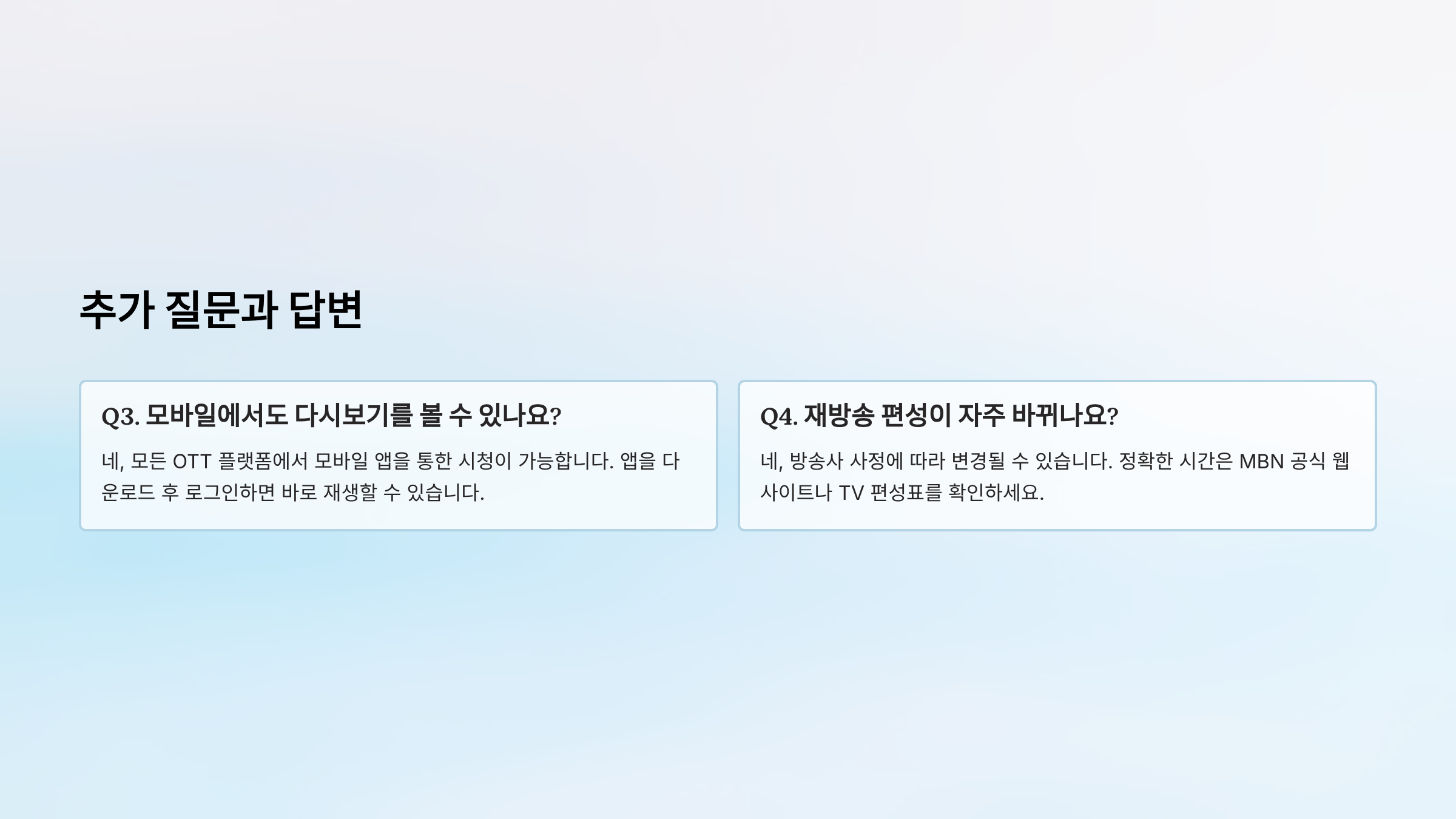 A. MBN 플러스(공식 채널)가 가장 빠릅니다. 본방송 후 바로 업로드되며, 로그인만으로 7일 무료 시청 가능합니다.