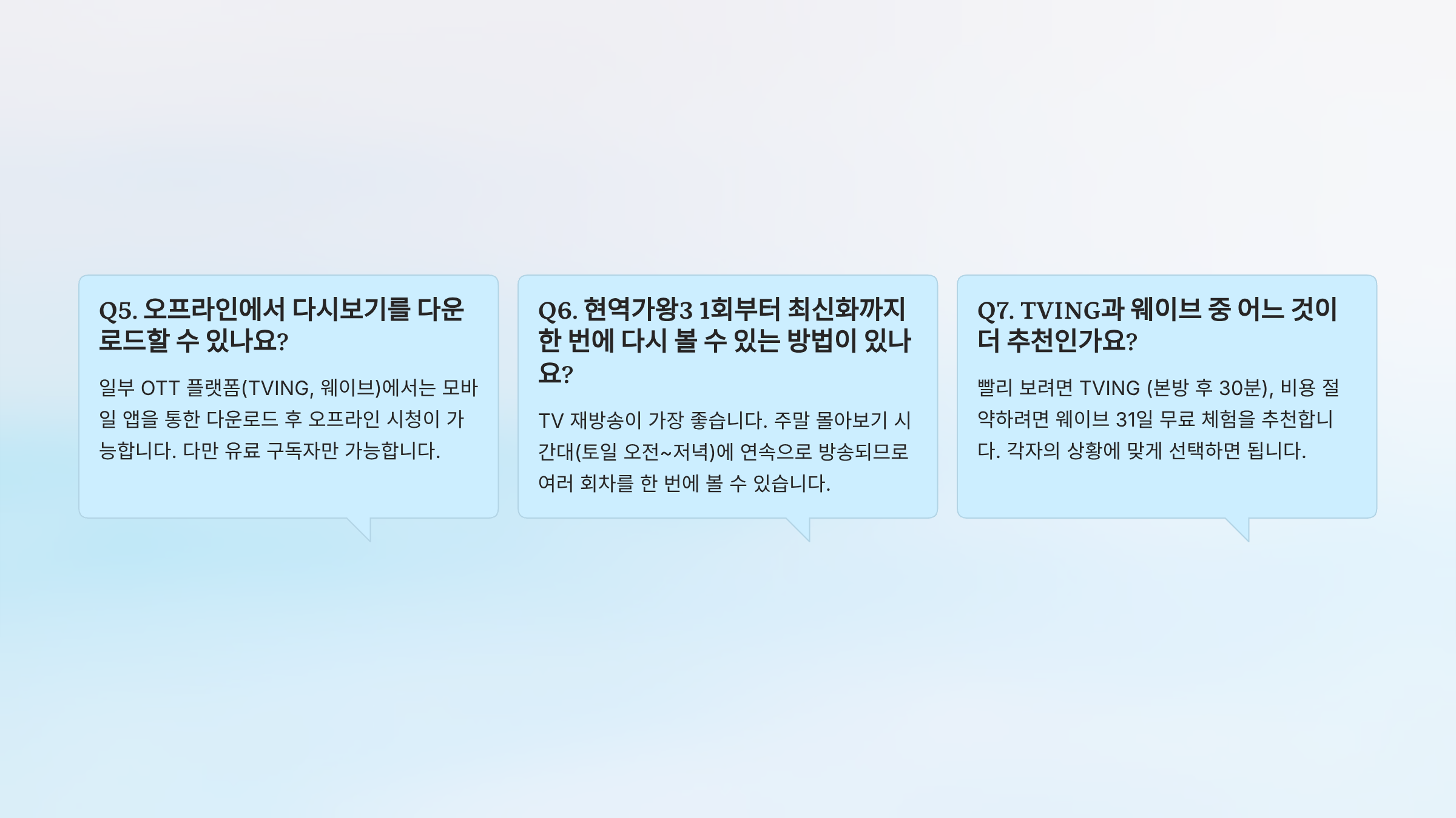 A. 빨리 보려면 TVING (본방 후 30분), 비용 절약하려면 웨이브 31일 무료 체험을 추천합니다. 각자의 상황에 맞게 선택하면 됩니다.