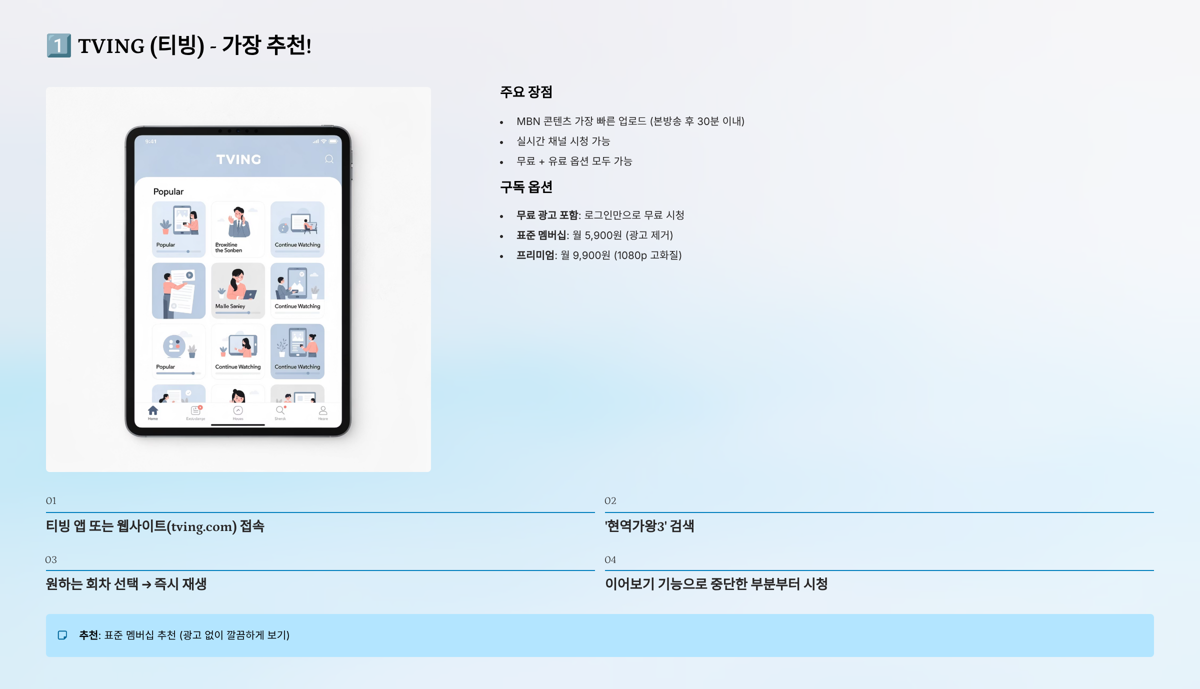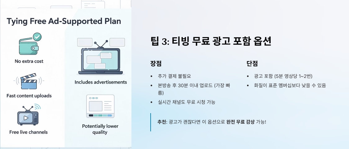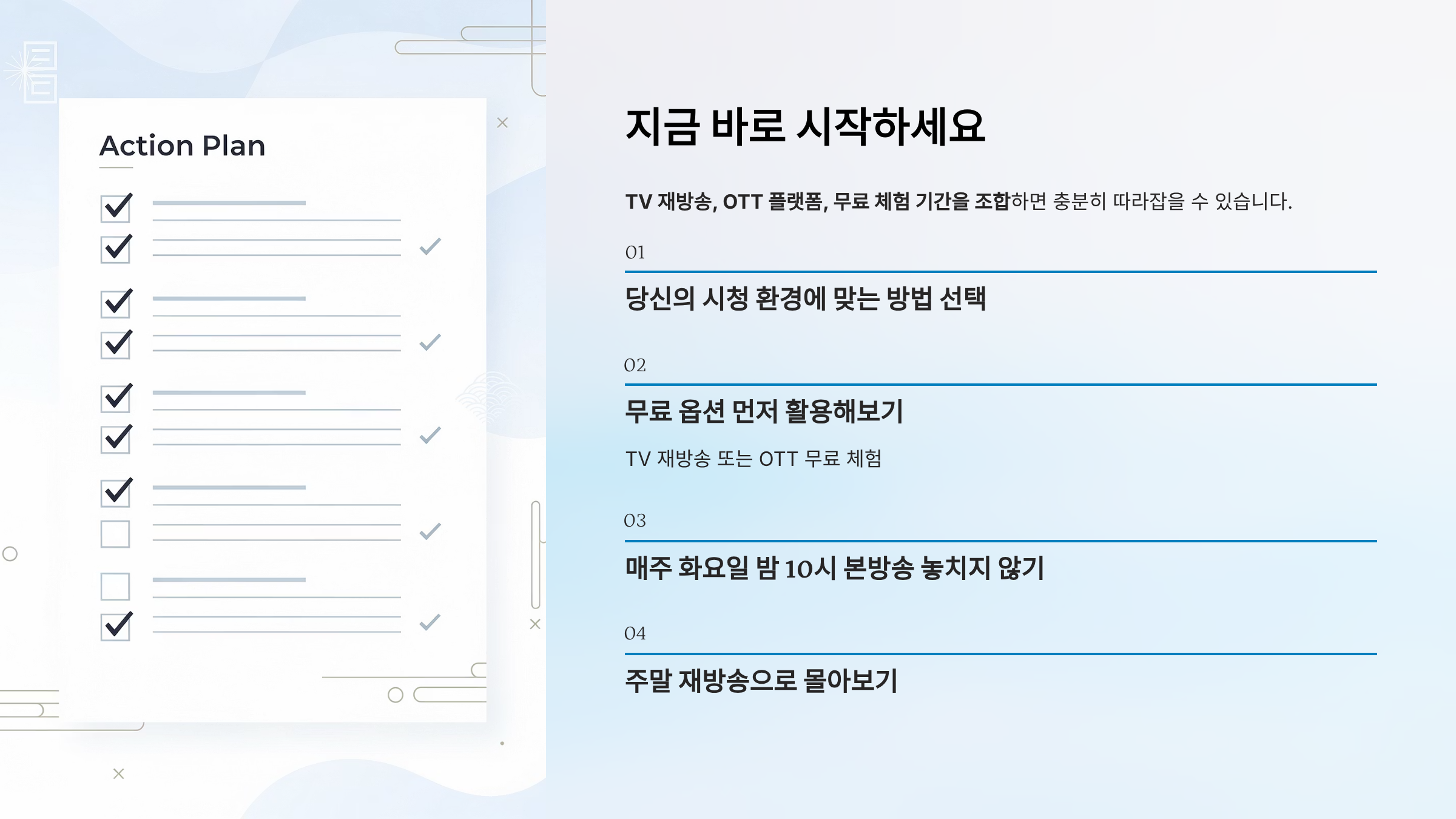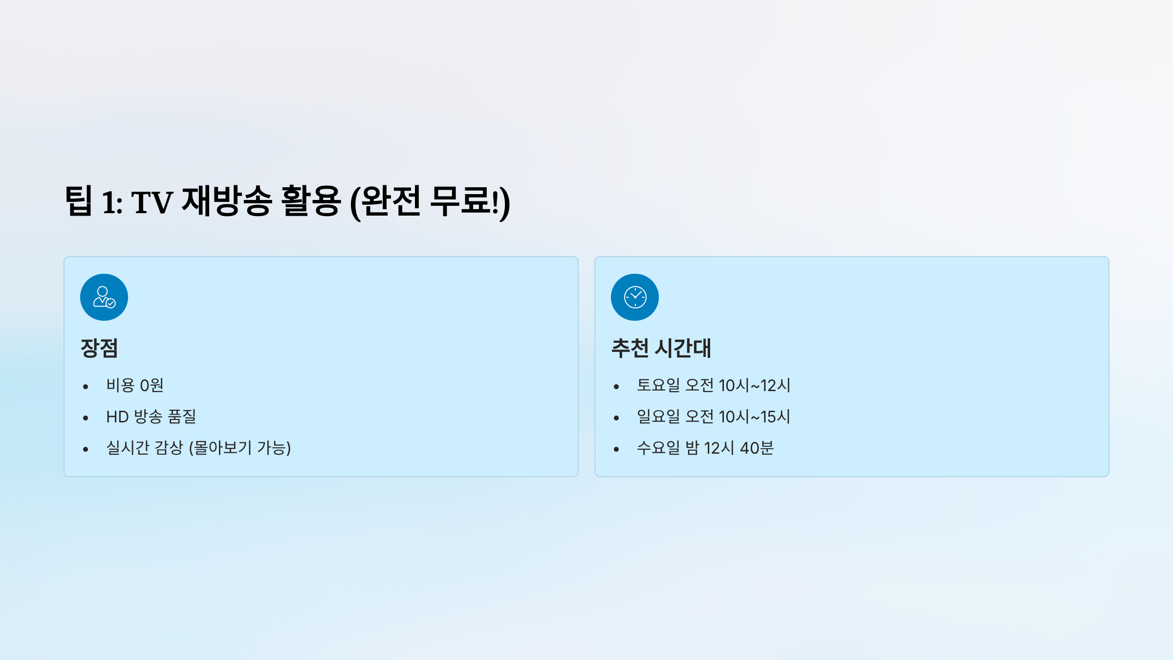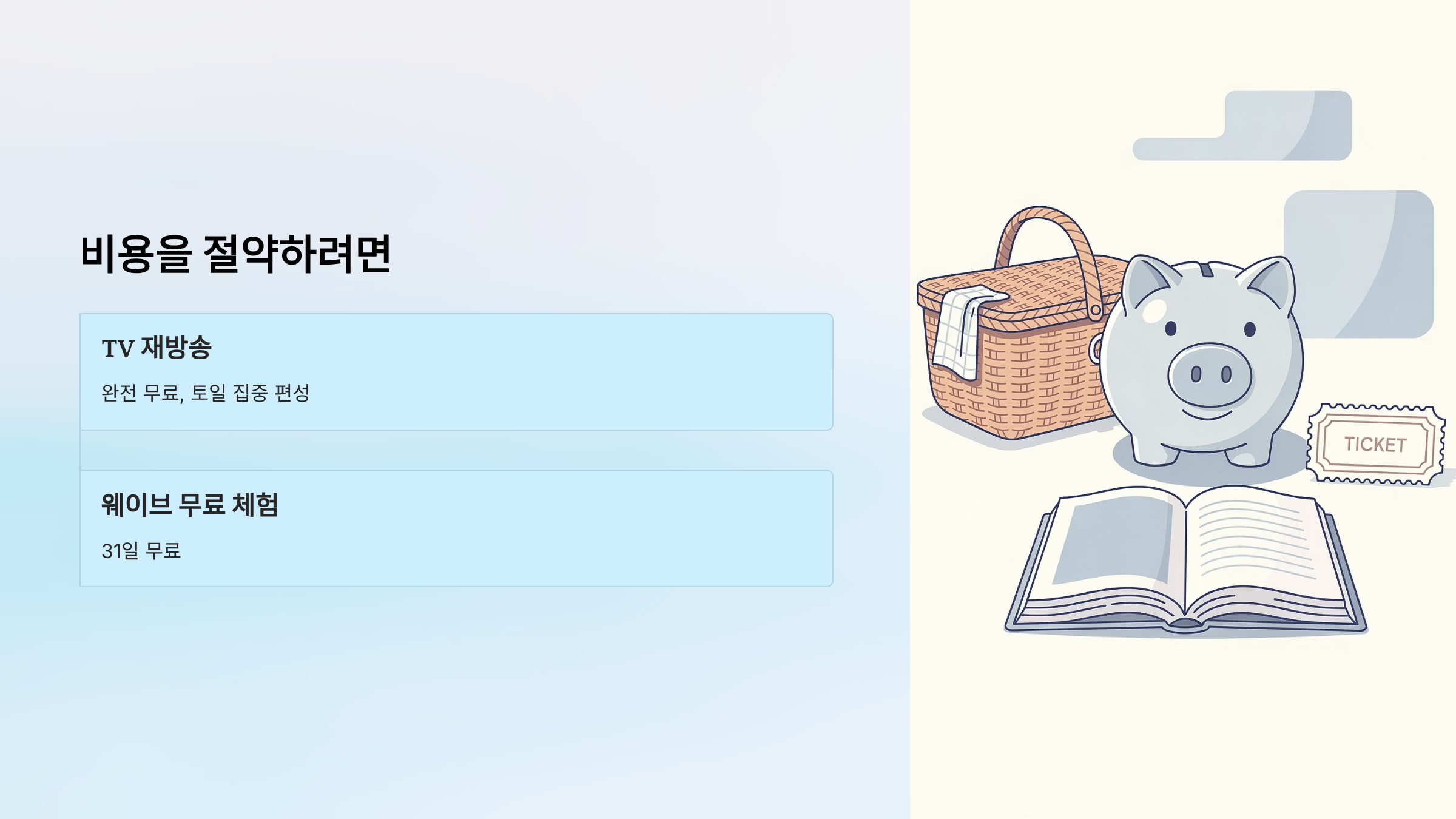 - 무료 옵션 먼저 활용해보기 (TV 재방송 또는 OTT 무료 체험)