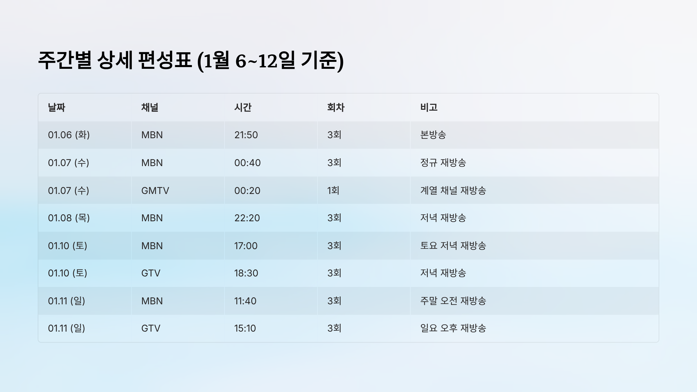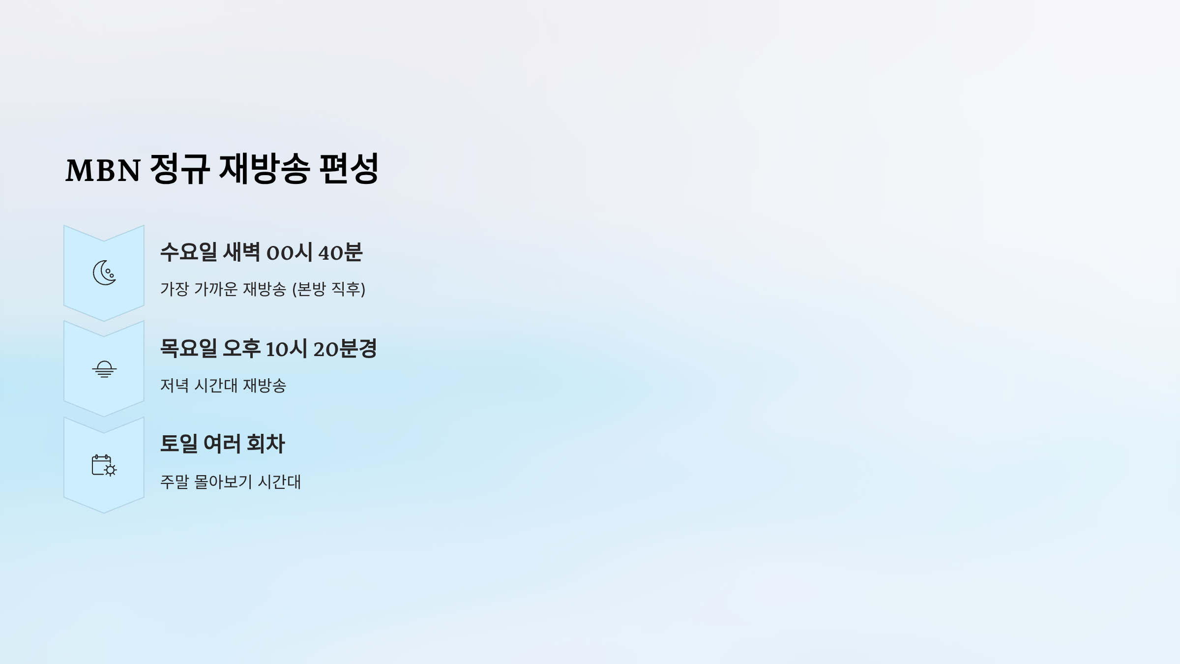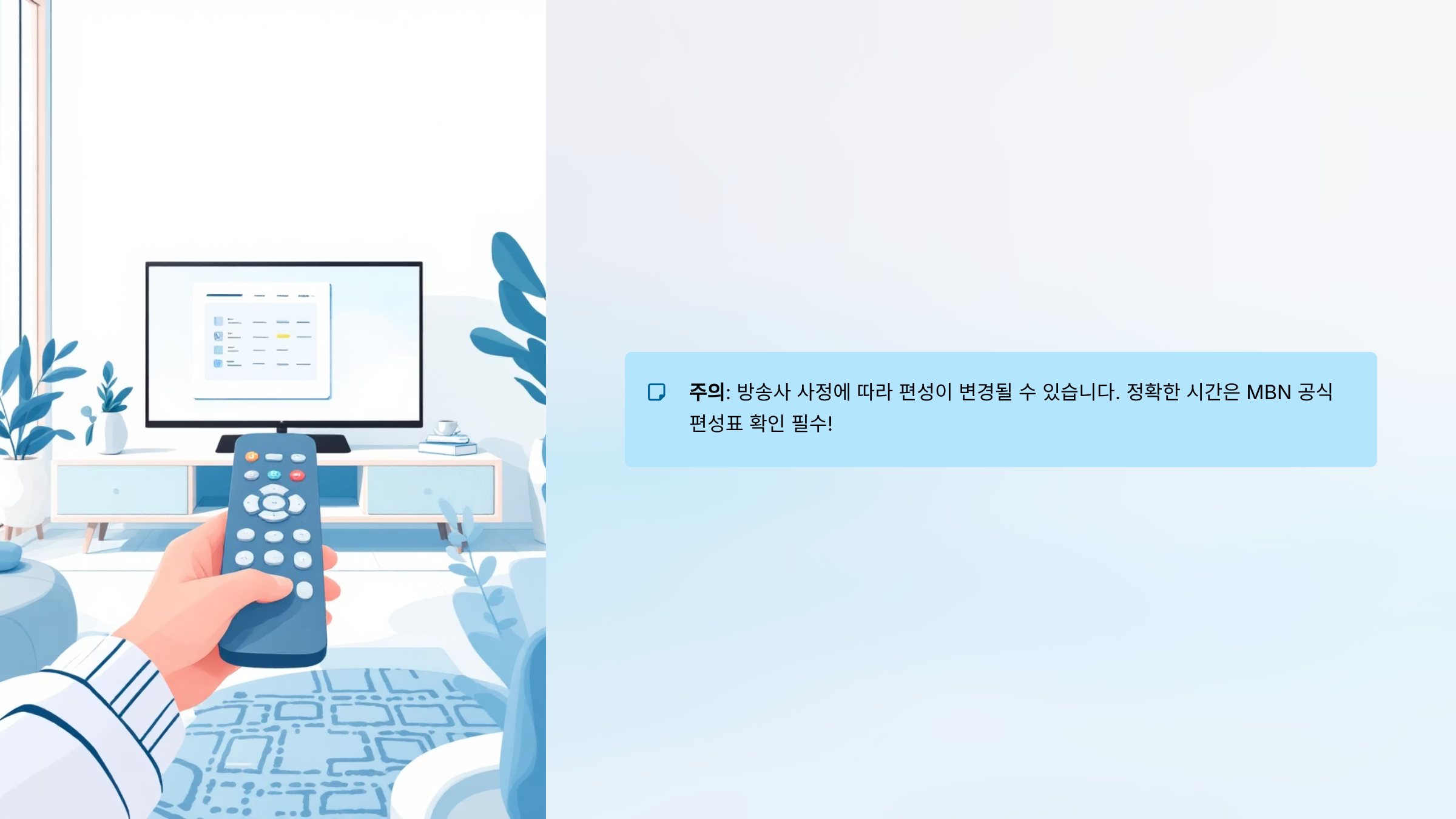 주의: 방송사 사정에 따라 편성이 변경될 수 있습니다. 정확한 시간은 MBN 공식 편성표 확인 필수!