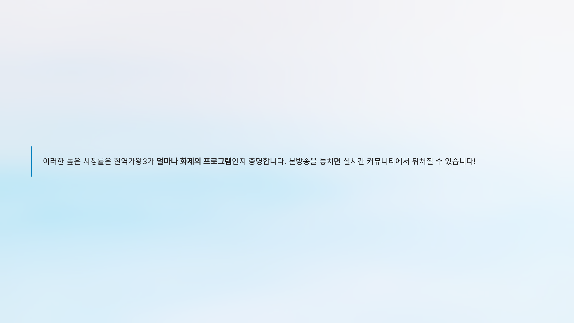 이러한 높은 시청률은 현역가왕3가 얼마나 화제의 프로그램인지 증명합니다. 본방송을 놓치면 실시간 커뮤니티에서 뒤처질 수 있습니다!