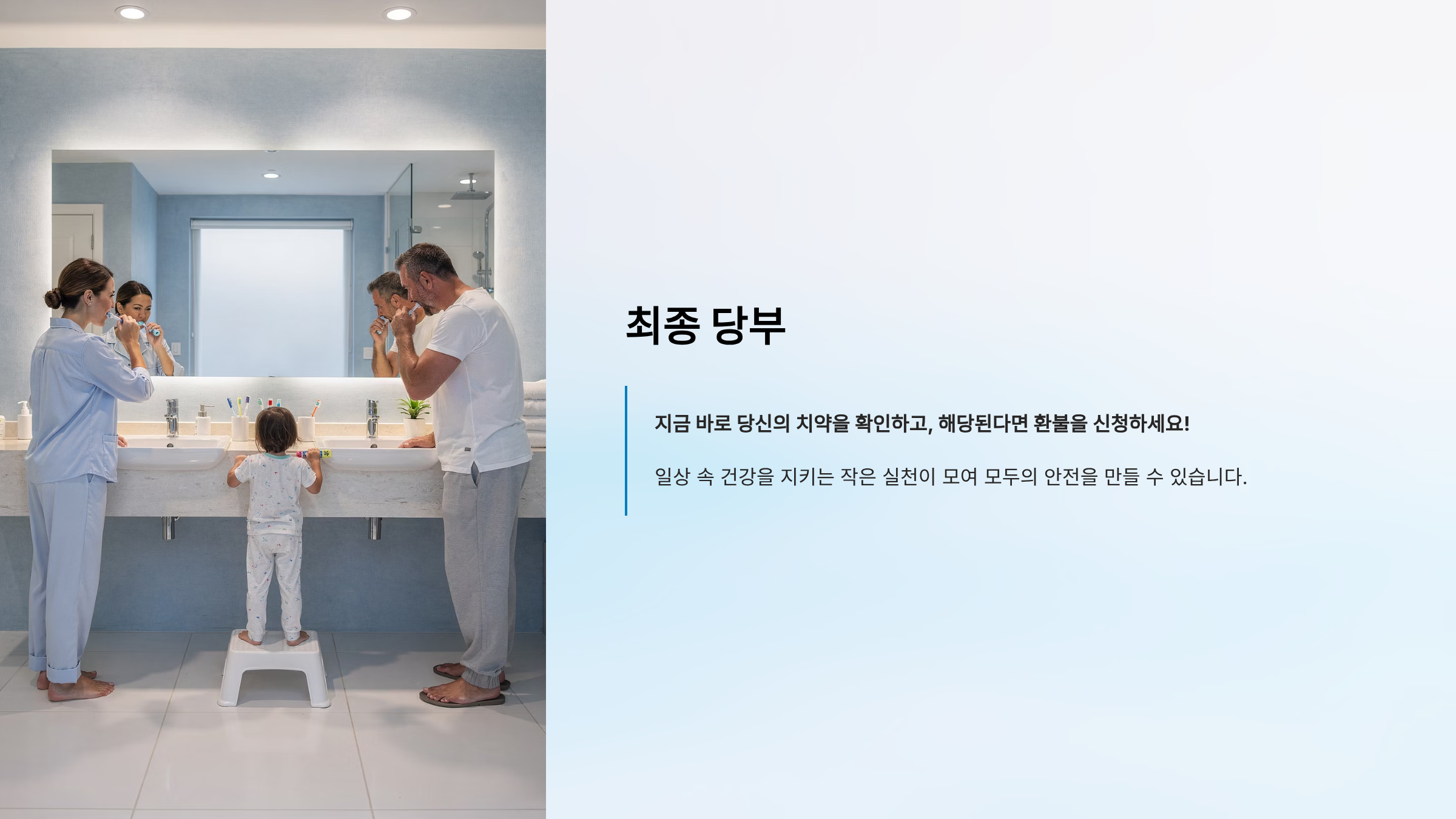 지금 바로 당신의 치약을 확인하고, 해당된다면 환불을 신청하세요! 일상 속 건강을 지키는 작은 실천이 모여 모두의 안전을 만들 수 있습니다.