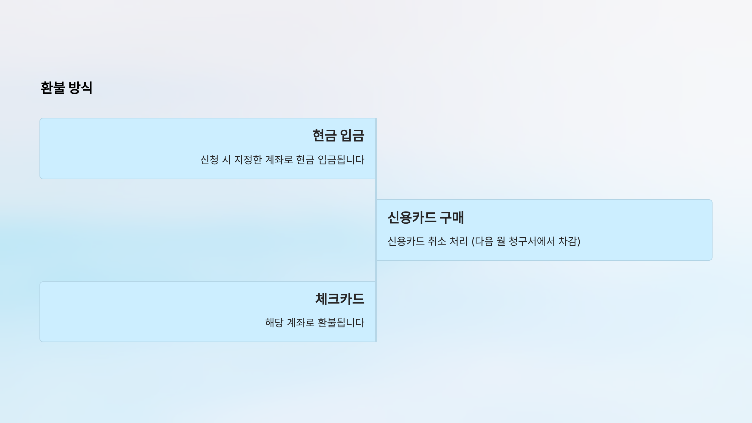 A. 신청 시 입력한 계좌로 현금 입금됩니다. 카드 구매라도 계좌 환불이 가장 편합니다. 신용카드 취소 원하면 신청 시 말씀하세요.