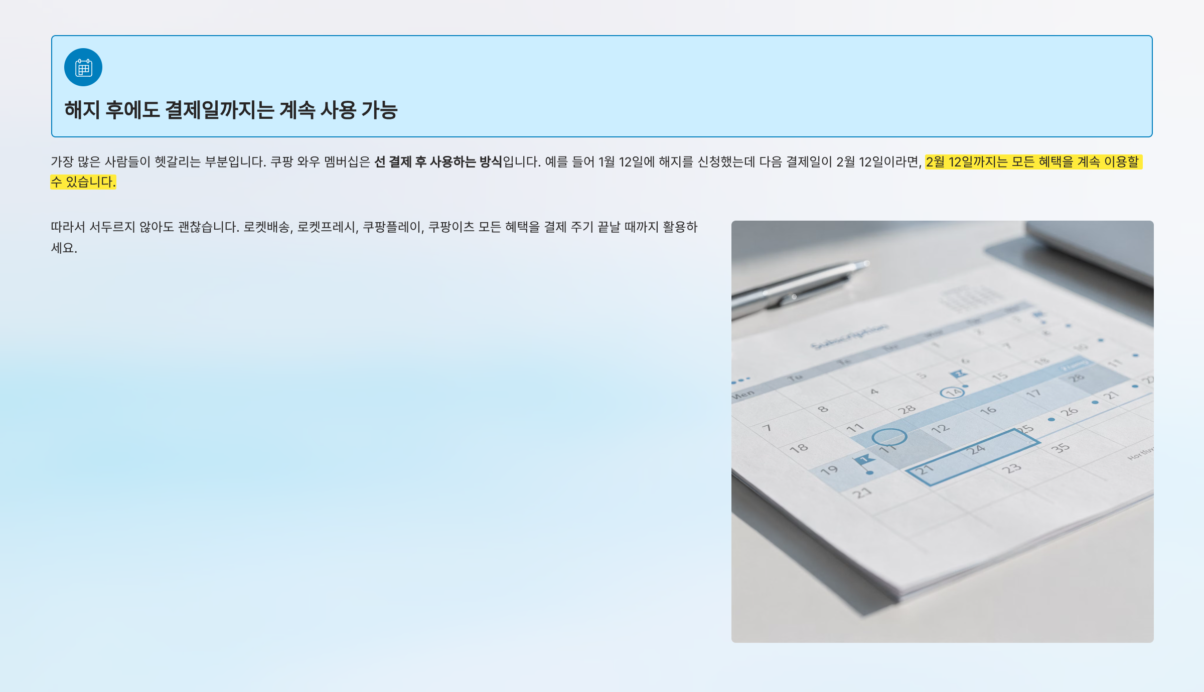 가장 많은 사람들이 헷갈리는 부분입니다. 쿠팡 와우 멤버십은 선 결제 후 사용하는 방식입니다. 예를 들어 1월 12일에 해지를 신청했는데 다음 결제일이 2월 12일이라면, 2월 12일까지는 모든 혜택을 계속 이용할 수 있습니다.