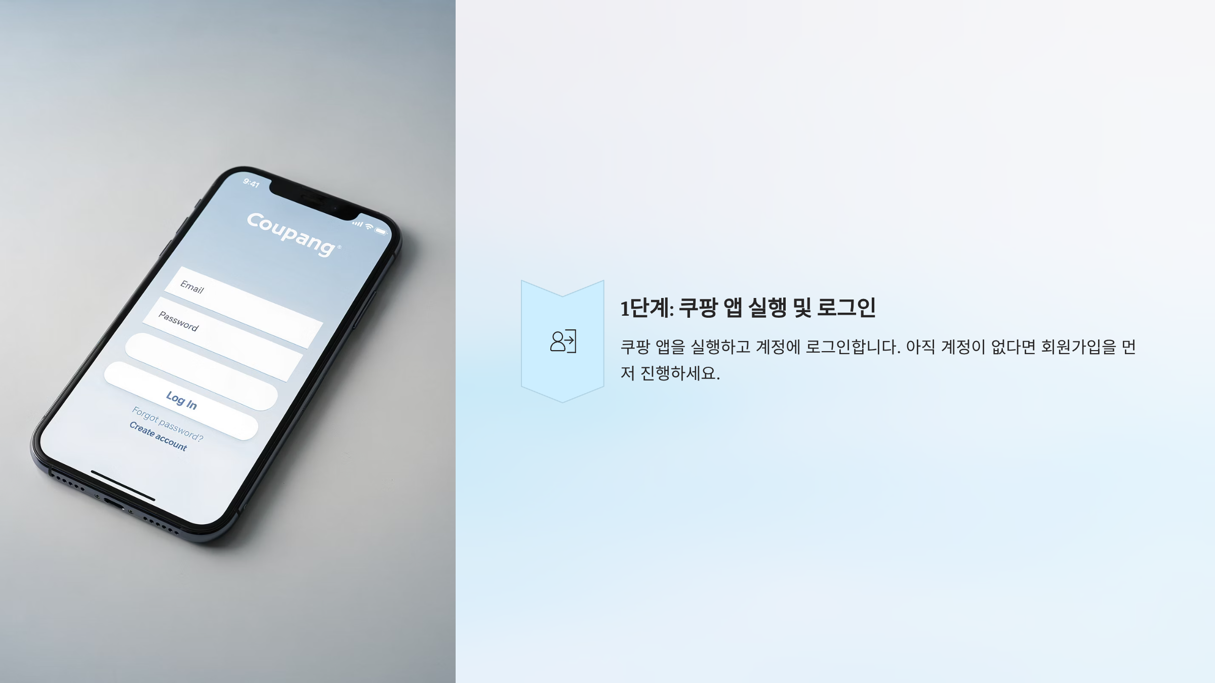 쿠팡 앱을 실행하고 계정에 로그인합니다. 아직 계정이 없다면 회원가입을 먼저 진행하세요.
