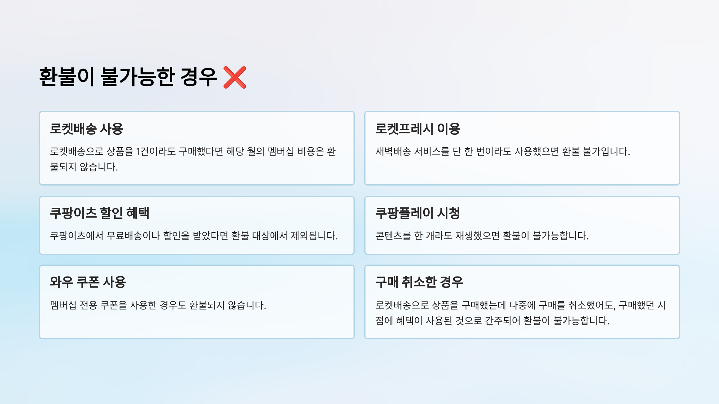 환불 불가능한 경우: 위의 혜택 중 단 하나라도 사용했다면 해당 월의 월회비는 환불되지 않습니다. 심지어 로켓배송으로 단 1건의 상품을 구매했어도 환불 대상에서 제외됩니다.