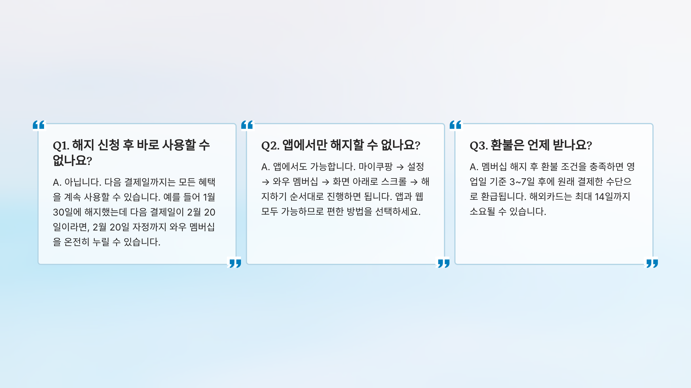 A. 멤버십 해지 후 환불 조건을 충족하면 영업일 기준 3~7일 후에 원래 결제한 수단으로 환급됩니다. 해외카드는 최대 14일까지 소요될 수 있습니다.