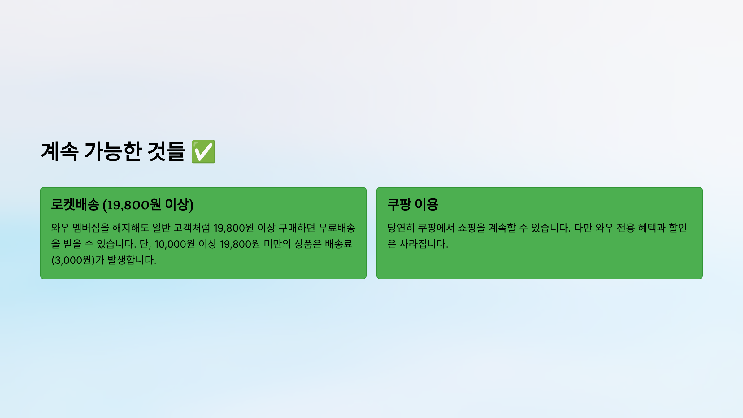 쿠팡 이용: 당연히 쿠팡에서 쇼핑을 계속할 수 있습니다. 다만 와우 전용 혜택과 할인은 사라집니다.