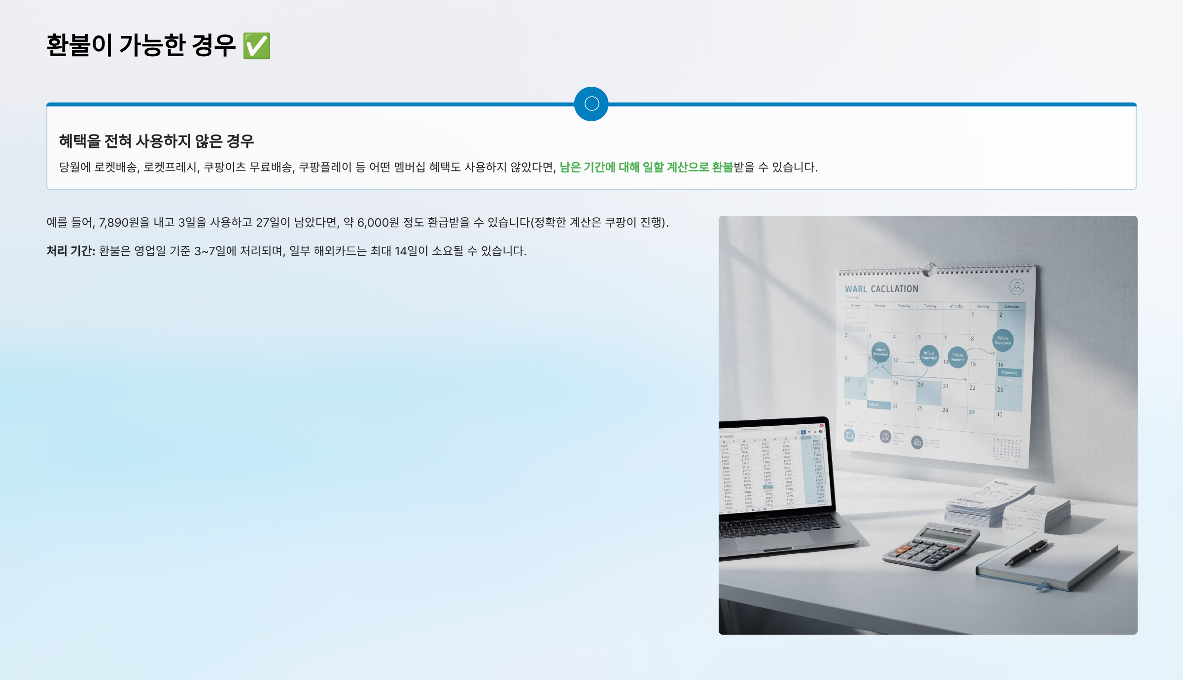 예를 들어, 7,890원을 내고 3일을 사용하고 27일이 남았다면, 약 6,000원 정도 환급받을 수 있습니다(정확한 계산은 쿠팡이 진행).