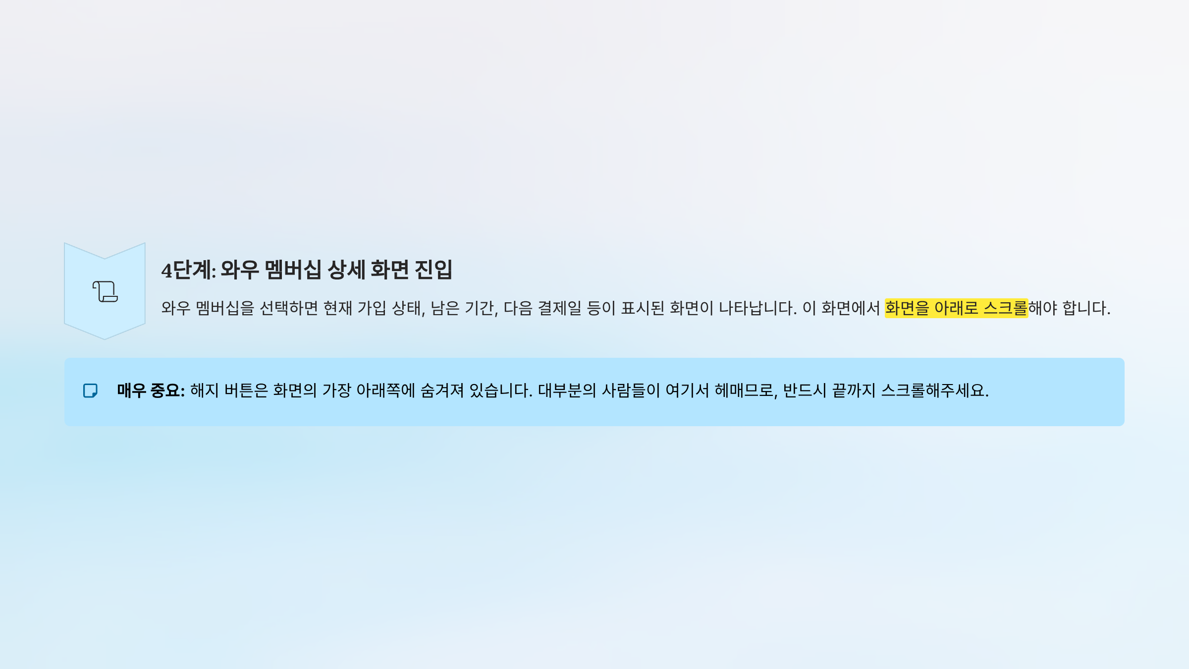 중요: 단순히 "멤버십" 또는 "구독"이라는 이름의 다른 메뉴가 있을 수 있으니, 정확히 "와우"가 들어간 메뉴를 찾으세요.