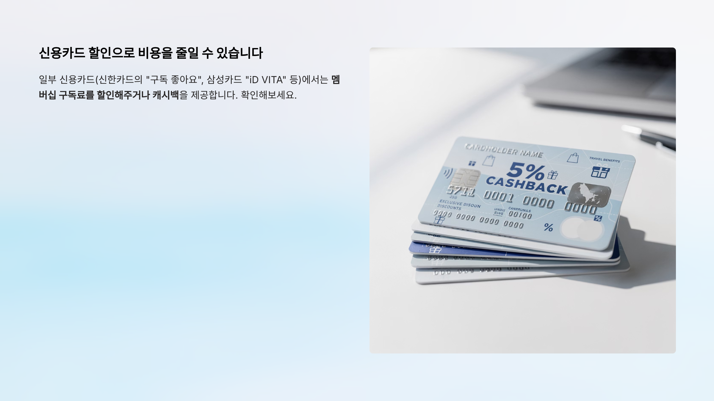 일부 신용카드(신한카드의 "구독 좋아요", 삼성카드 "iD VITA" 등)에서는 멤버십 구독료를 할인해주거나 캐시백을 제공합니다. 확인해보세요.