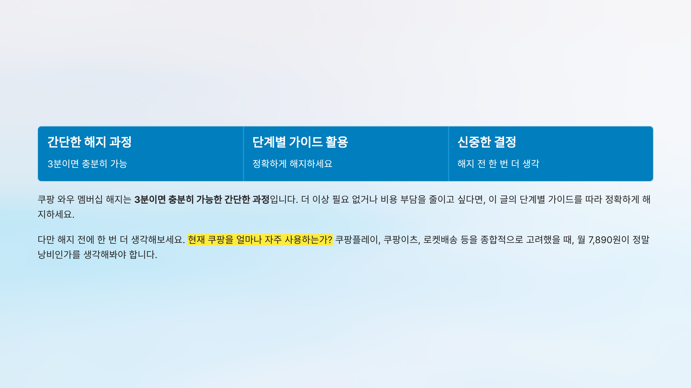다만 해지 전에 한 번 더 생각해보세요. 현재 쿠팡을 얼마나 자주 사용하는가? 쿠팡플레이, 쿠팡이츠, 로켓배송 등을 종합적으로 고려했을 때, 월 7,890원이 정말 낭비인가를 생각해봐야 합니다.
