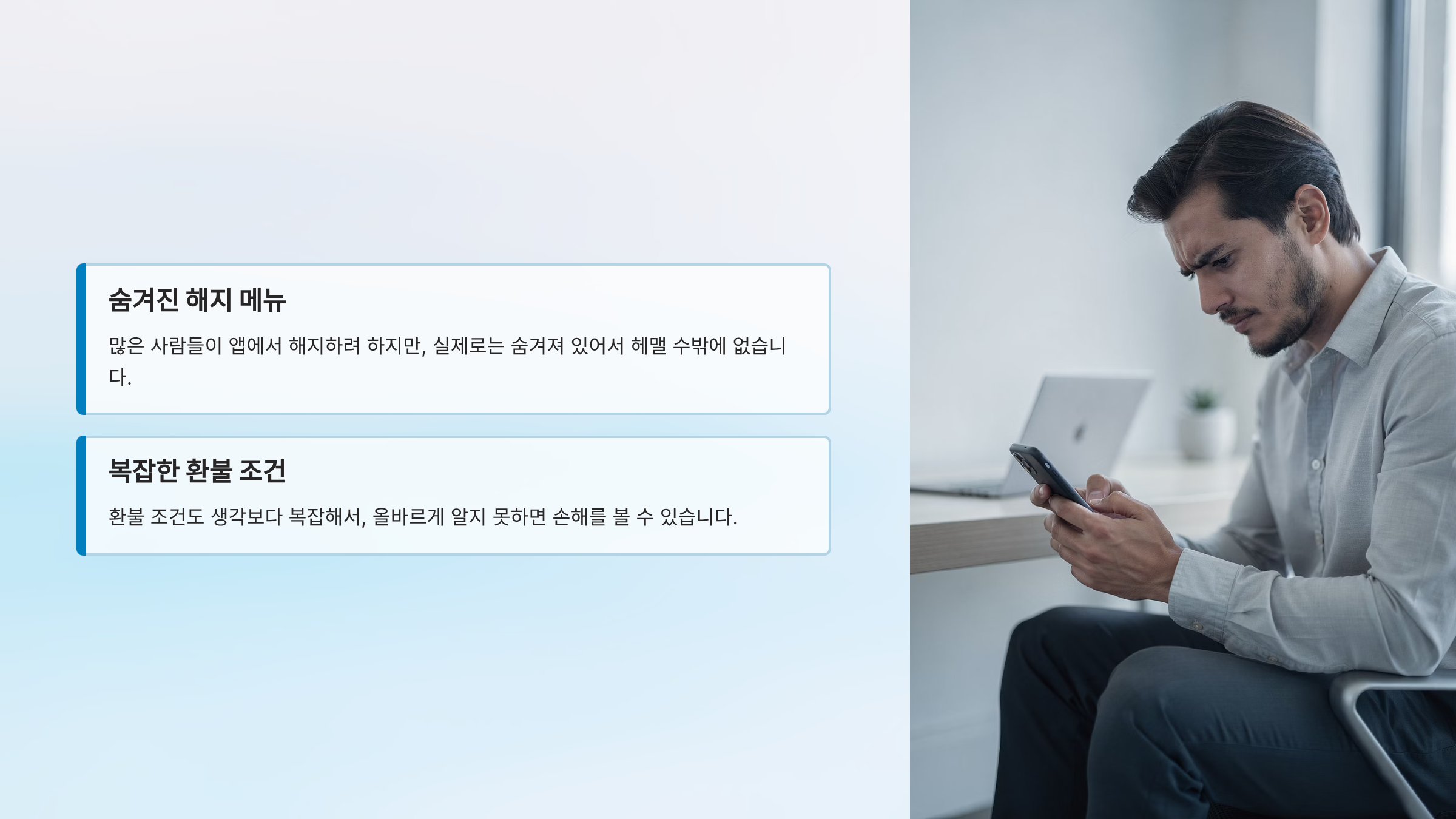 문제는 해지 방법을 찾기가 쉽지 않다는 것입니다. 많은 사람들이 앱에서 해지하려 하지만, 실제로는 숨겨져 있어서 헤맬 수밖에 없죠. 또한 환불 조건도 생각보다 복잡해서, 올바르게 알지 못하면 손해를 볼 수 있습니다.