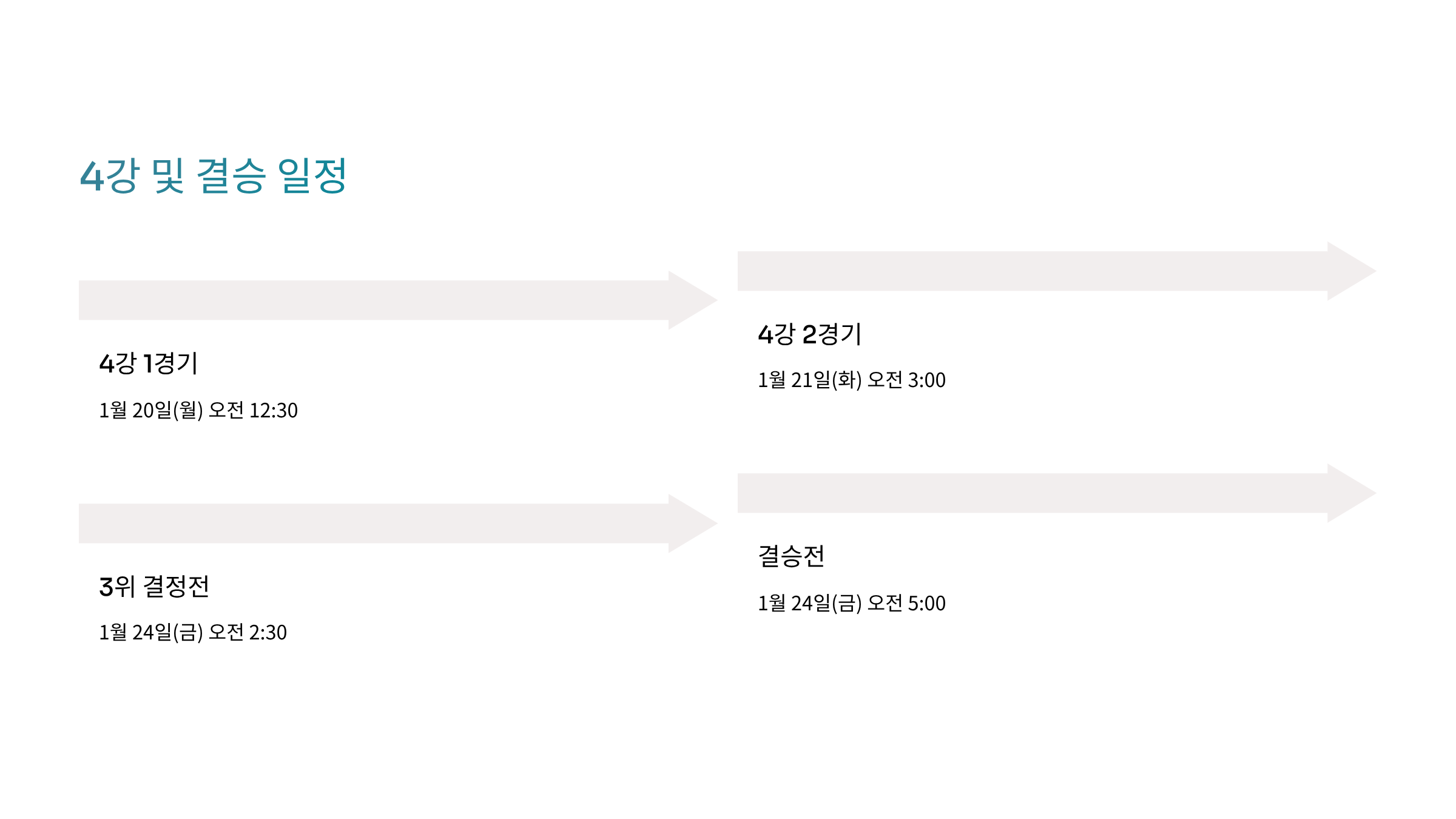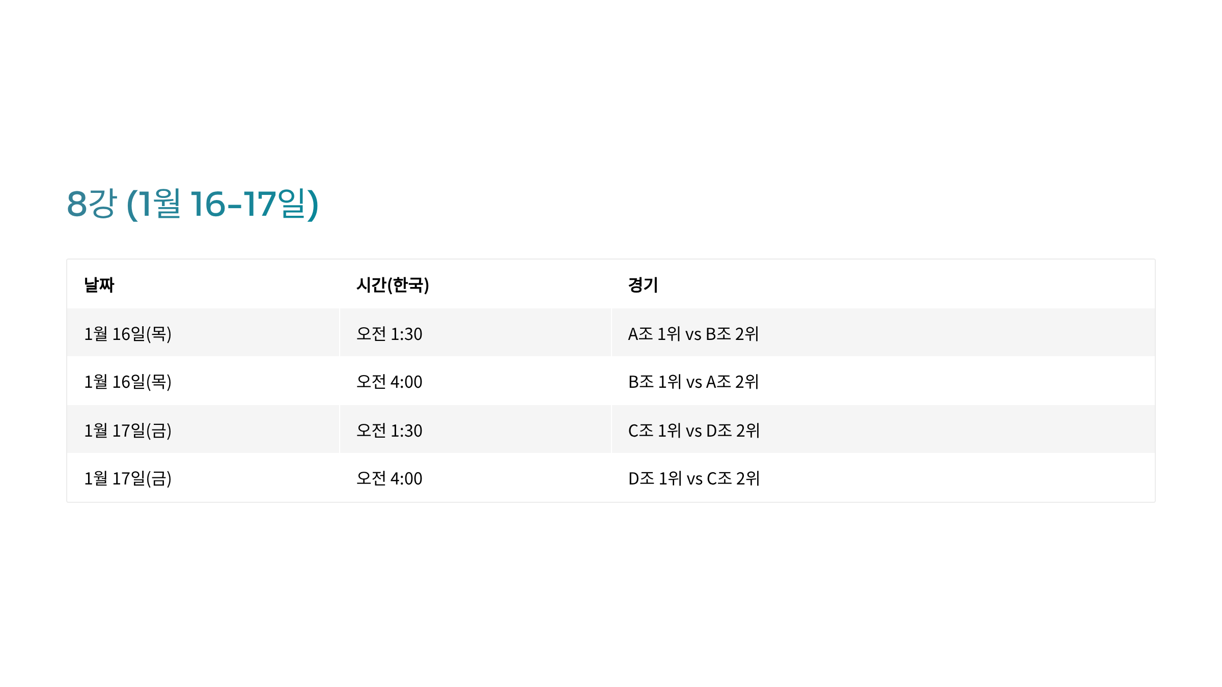 | 1월 16일(목) | 오전 4:00 | B조 1위 vs A조 2위 |