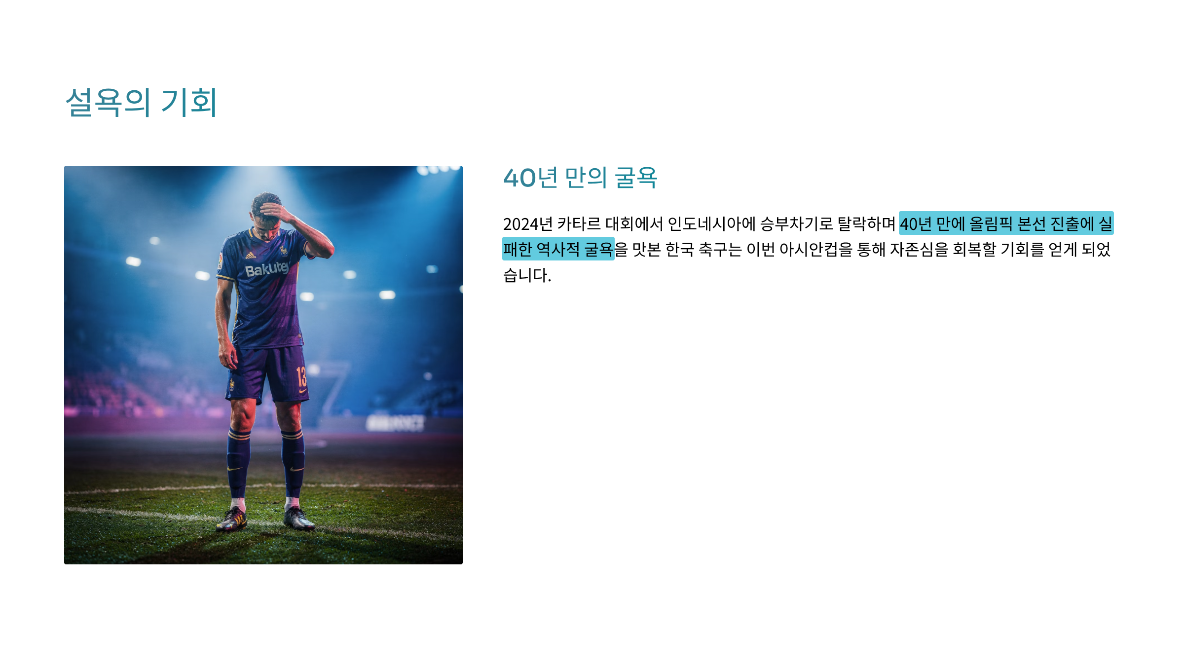 특히 2024년 카타르 대회에서 인도네시아에 승부차기로 탈락하며 40년 만에 올림픽 본선 진출에 실패한 역사적 굴욕을 맛본 한국 축구는 이번 아시안컵을 통해 자존심을 회복할 기회를 얻게 되었습니다.